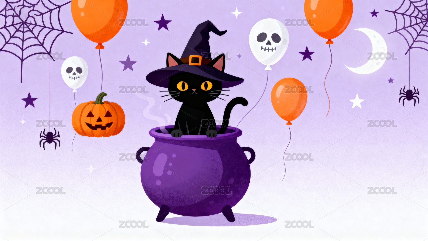 萬圣節(jié)主題插畫包含南瓜貓和魔法鍋