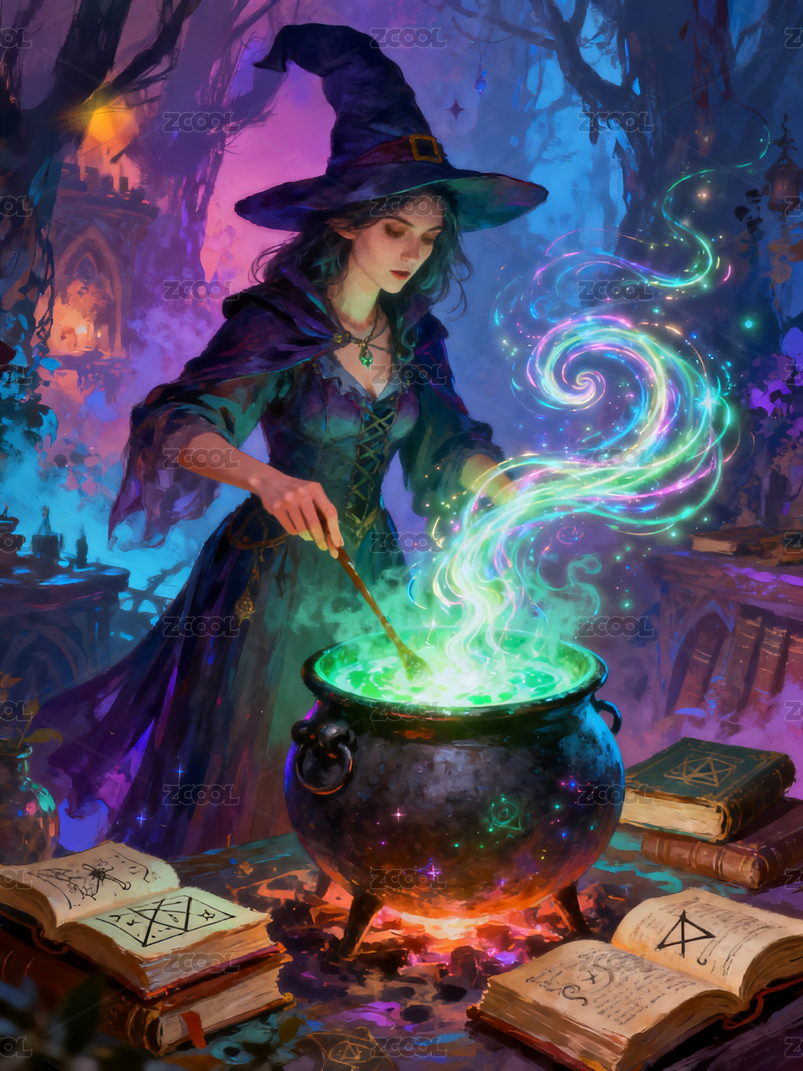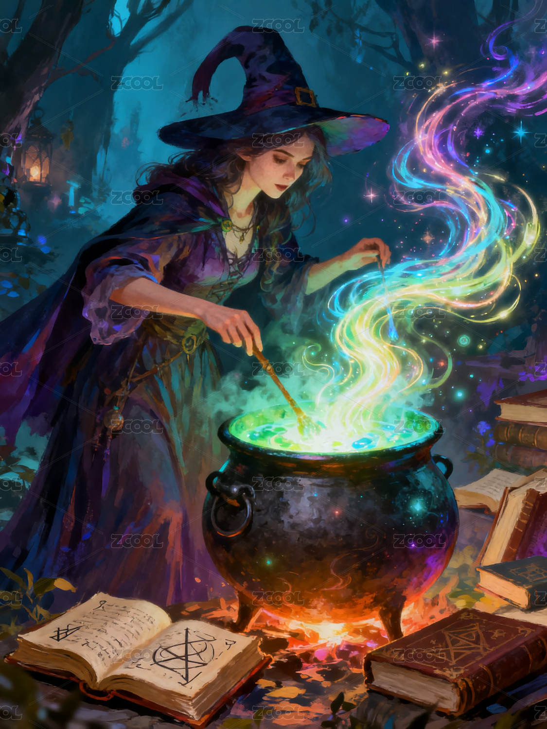 女巫攪拌魔法鍋森林施法儀式