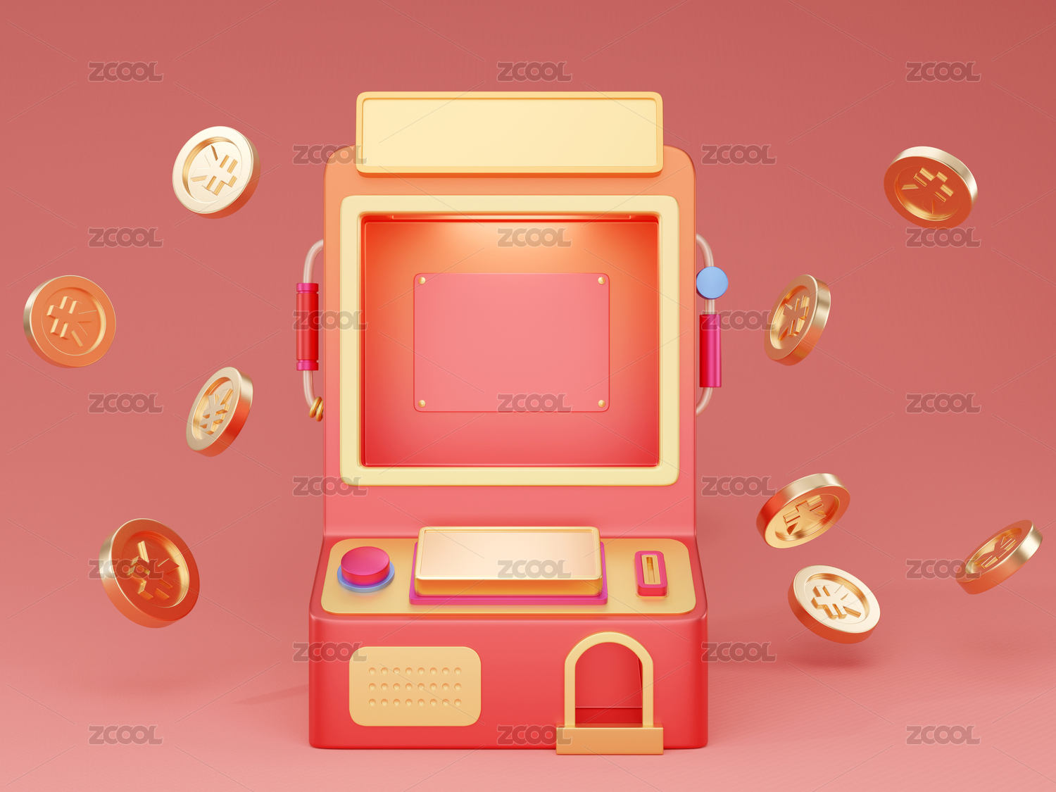 灑落金幣在紅色背景中的卡通游戲扭蛋機