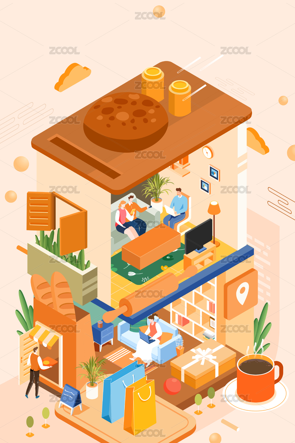 2.5D等距美食城市服務(wù)矢量插畫