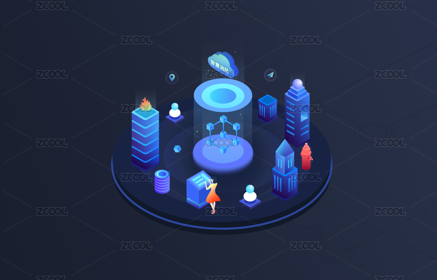 智慧城市智慧消防科技感2.5D插畫
