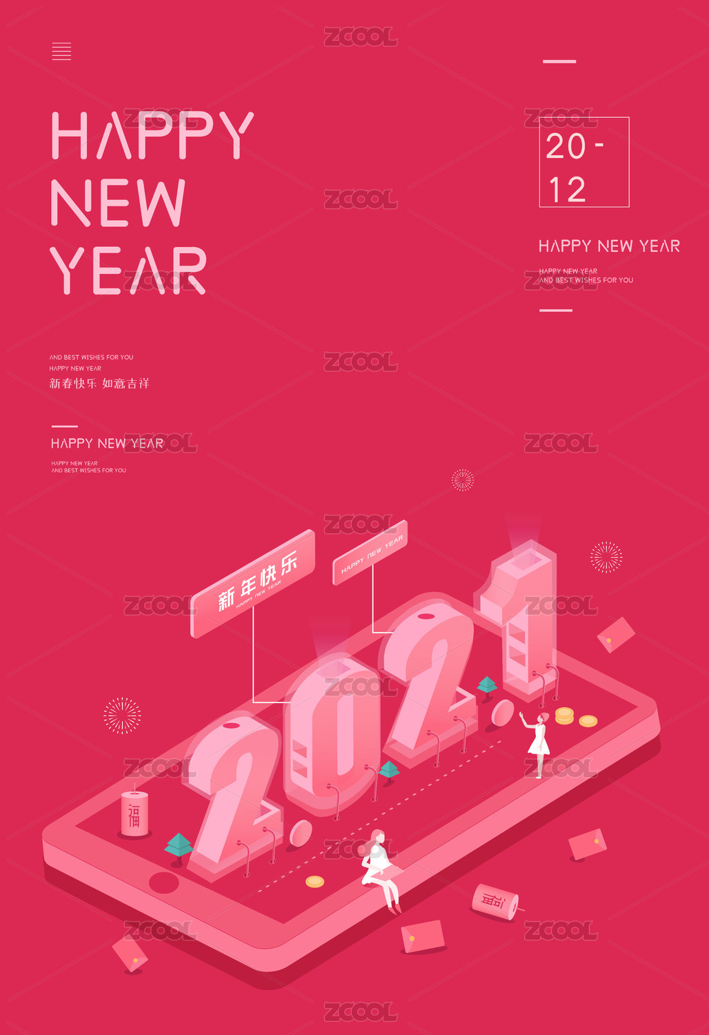 紅色2021數(shù)字2.5D牛年矢量插畫