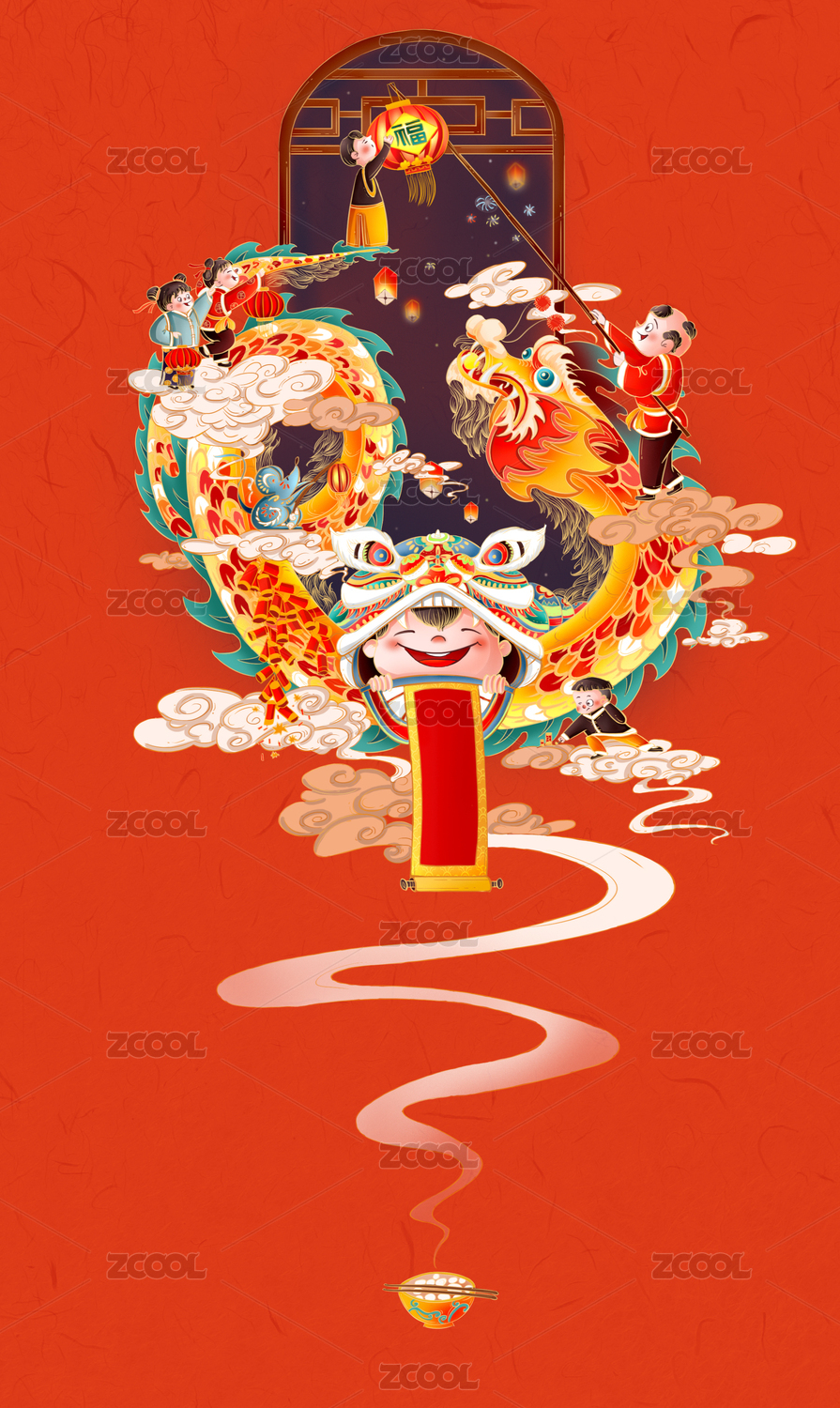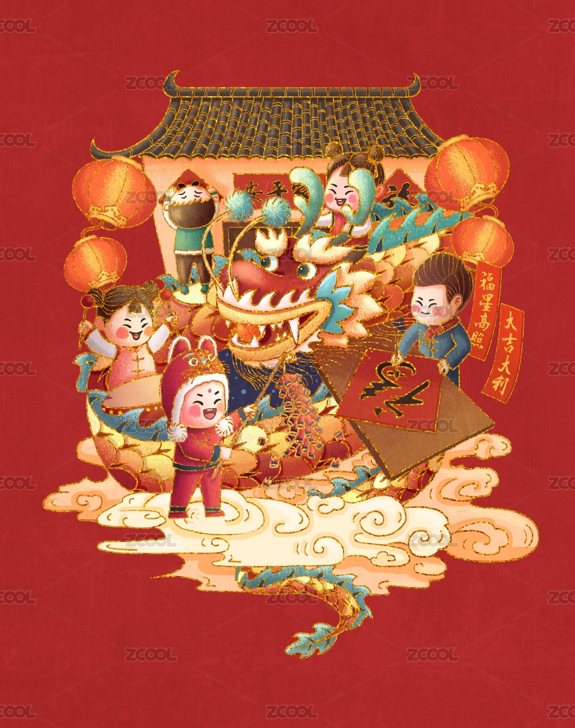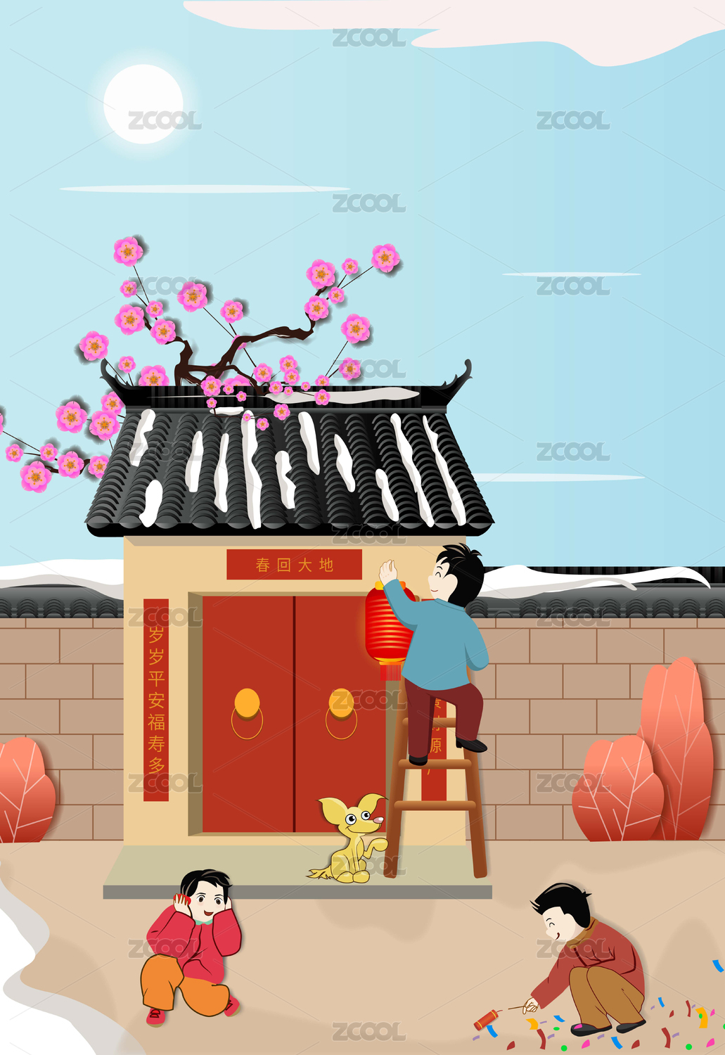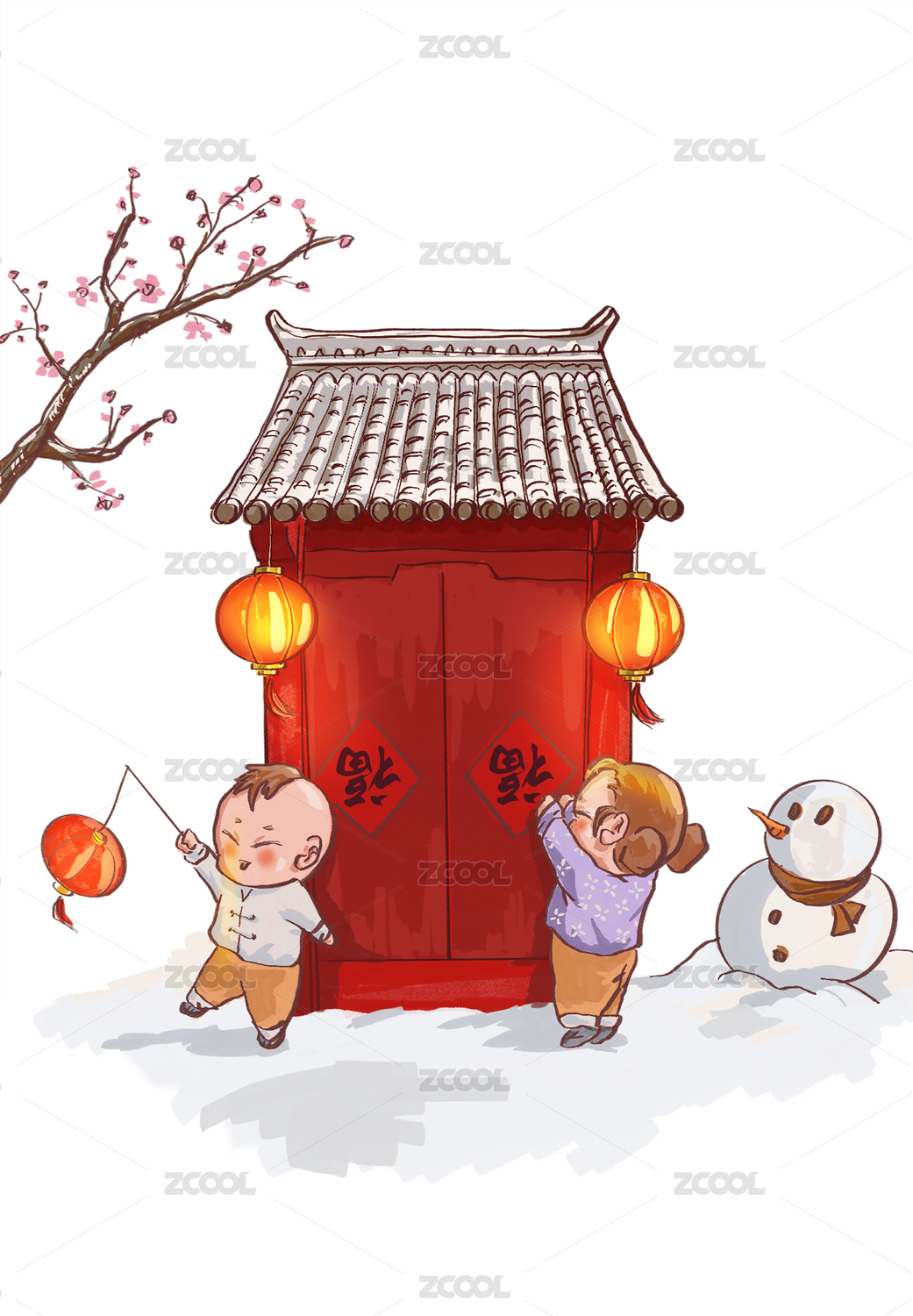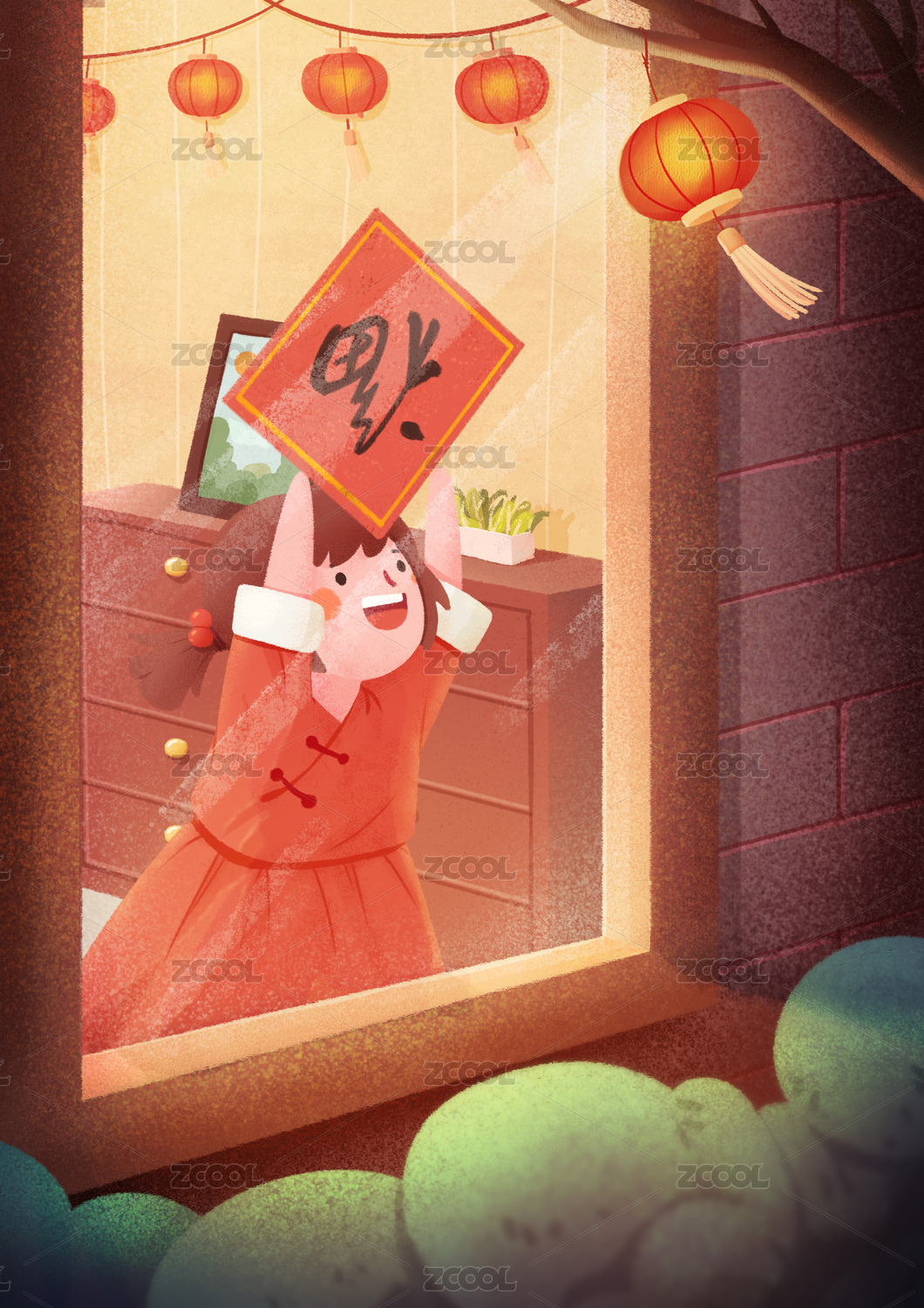 春節(jié)除夕新年小女孩貼福字掛燈籠手繪插畫