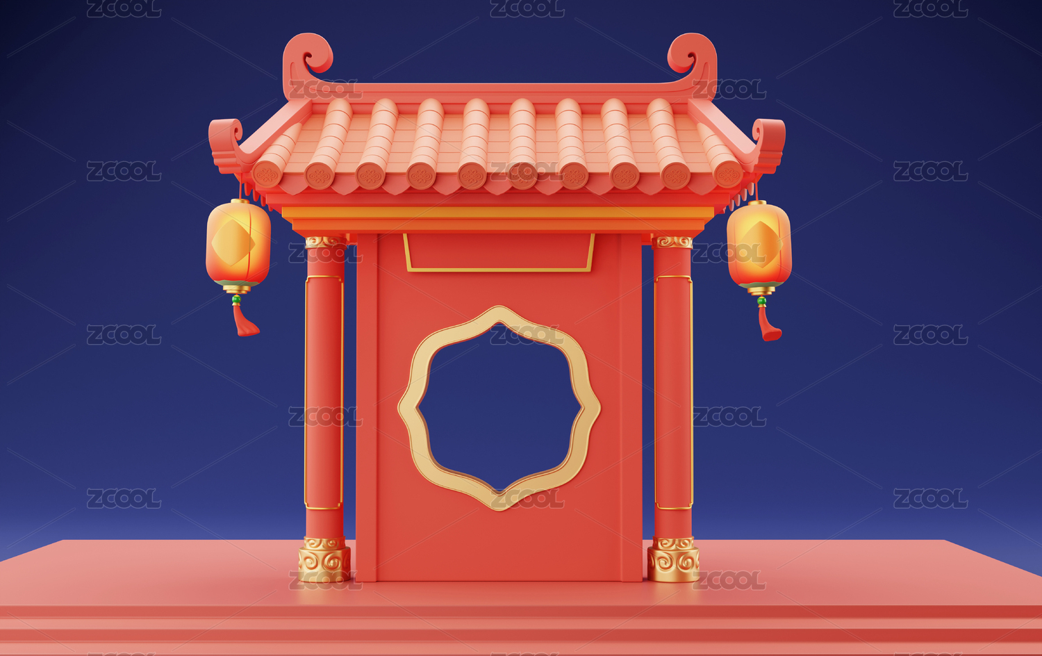 喜慶節(jié)日掛燈籠的紅瓦中空3D傳統(tǒng)建筑牌坊