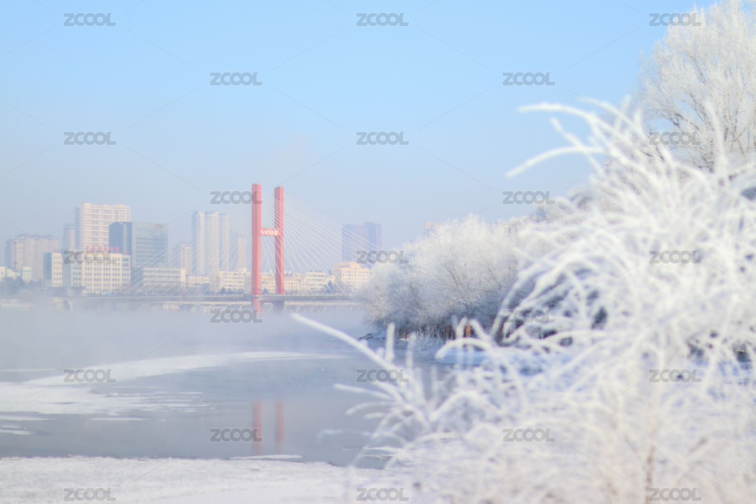 中國(guó)吉林市冬日霧凇江景