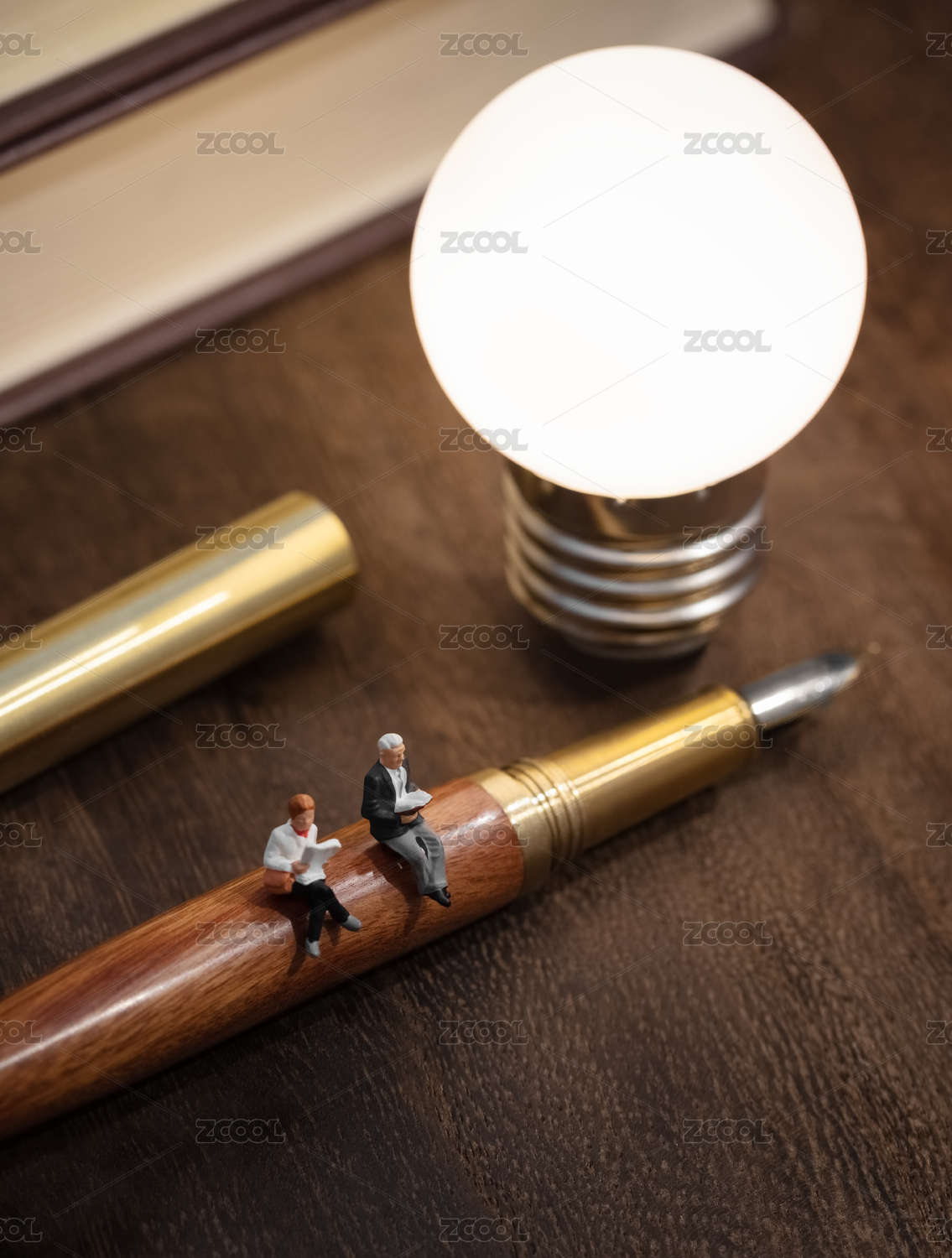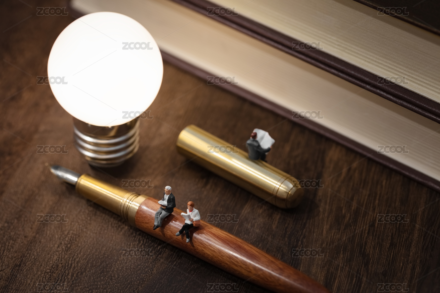 微縮創(chuàng)意暖色系書本木桌上燈泡鋼筆上閱讀
