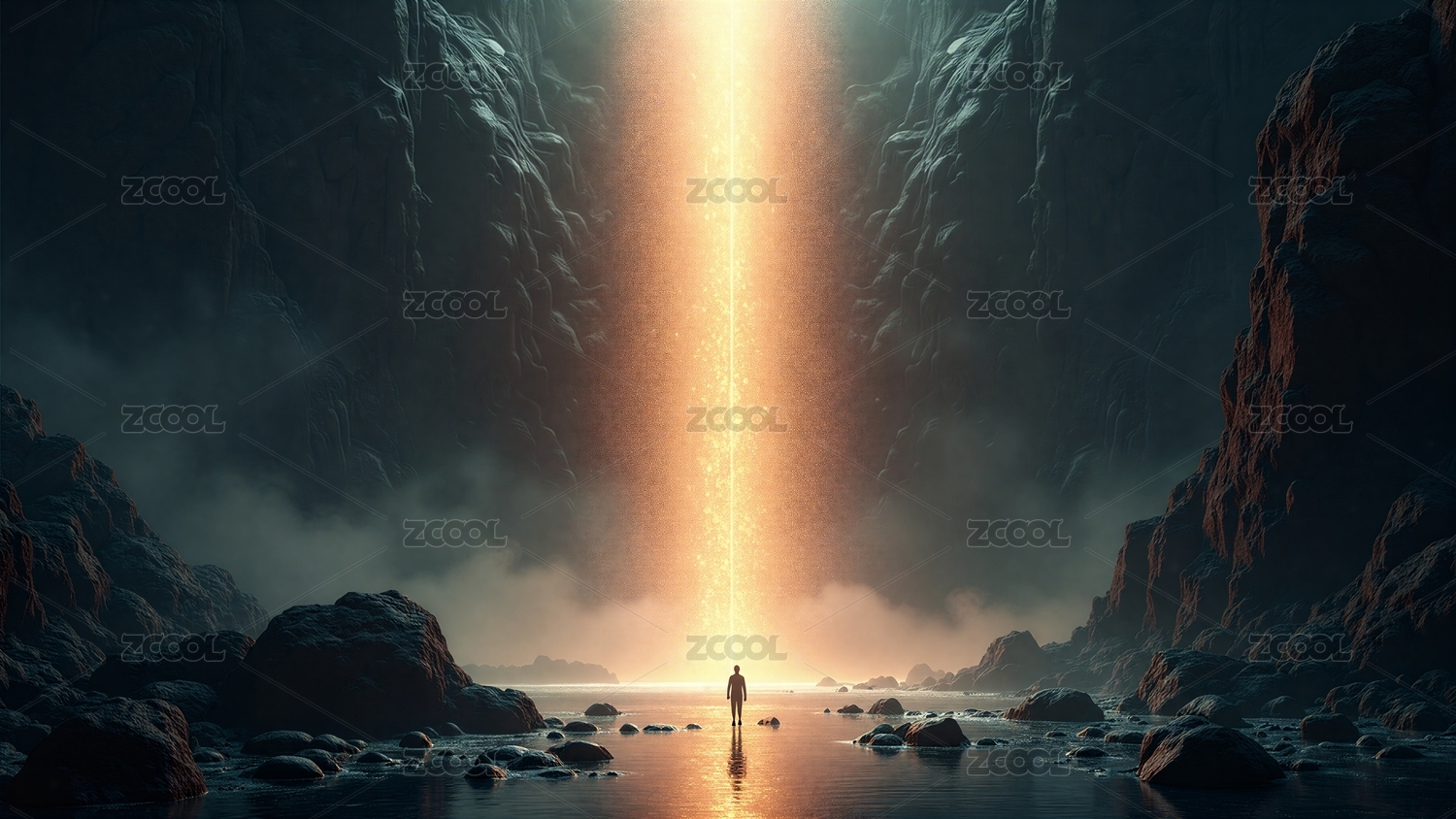 巖石與亮光下的神秘水景