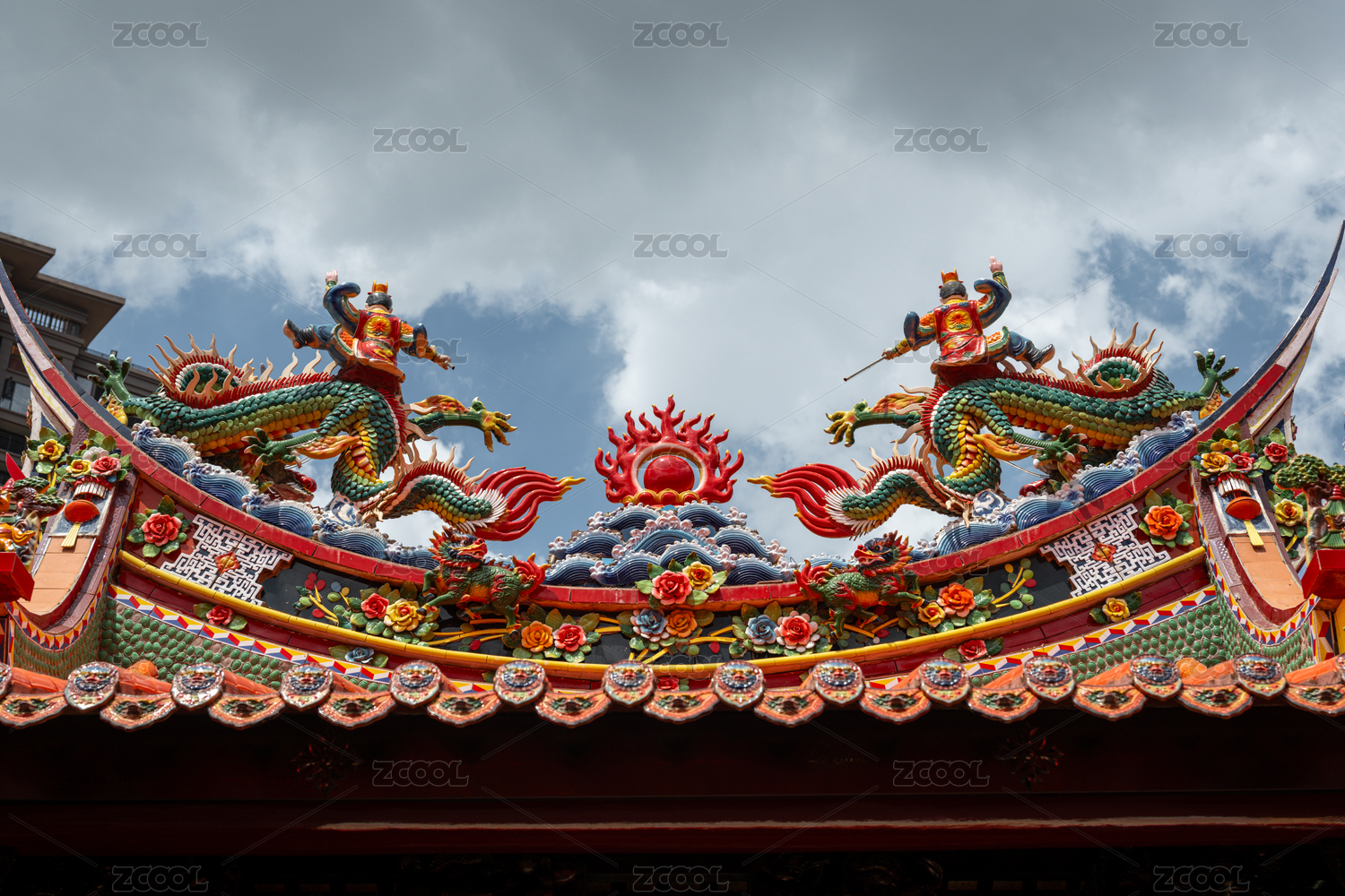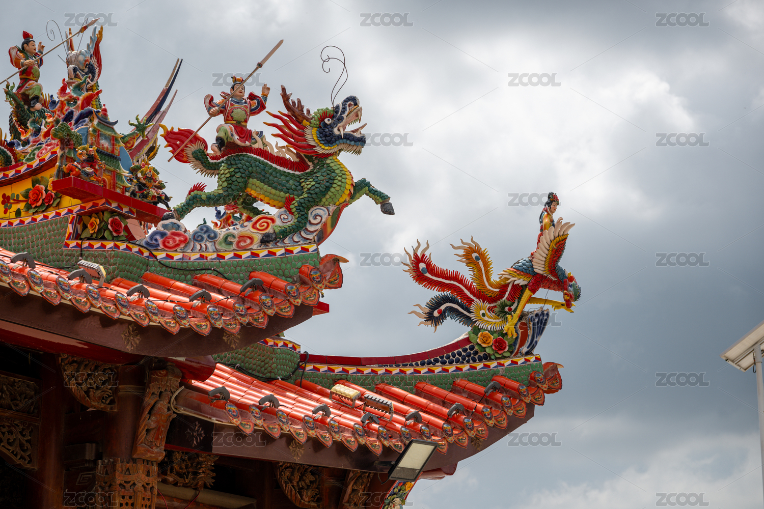 傳統(tǒng)廟宇屋頂上的彩繪龍雕