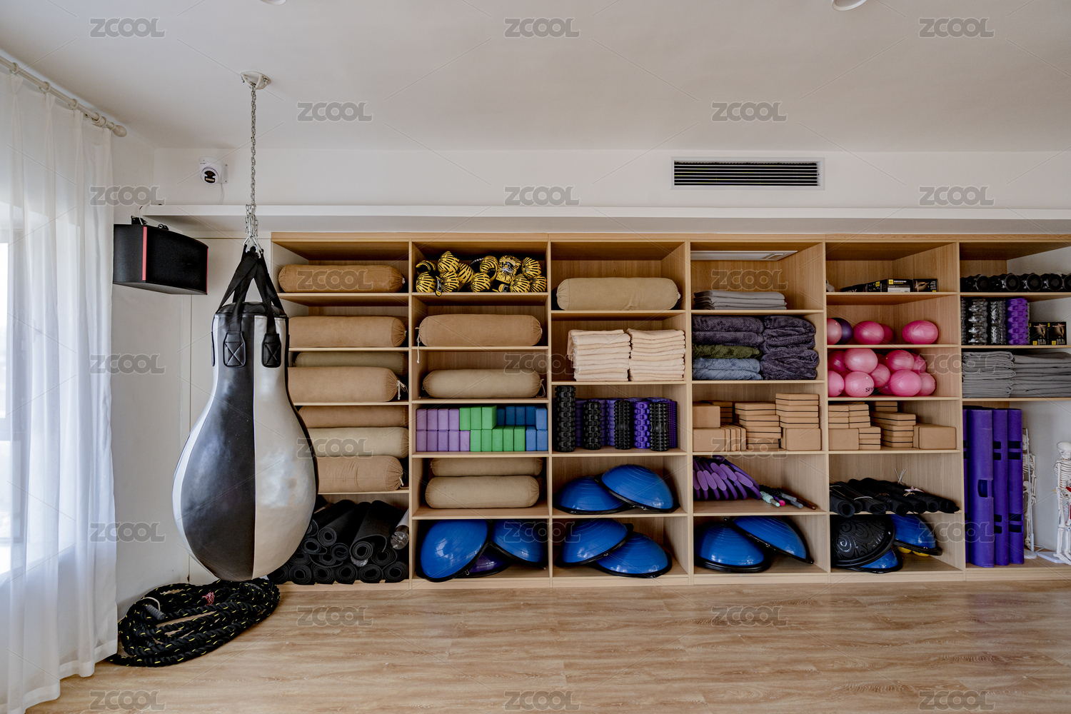 室內(nèi)健身館內(nèi)架子上擺放的各種器材