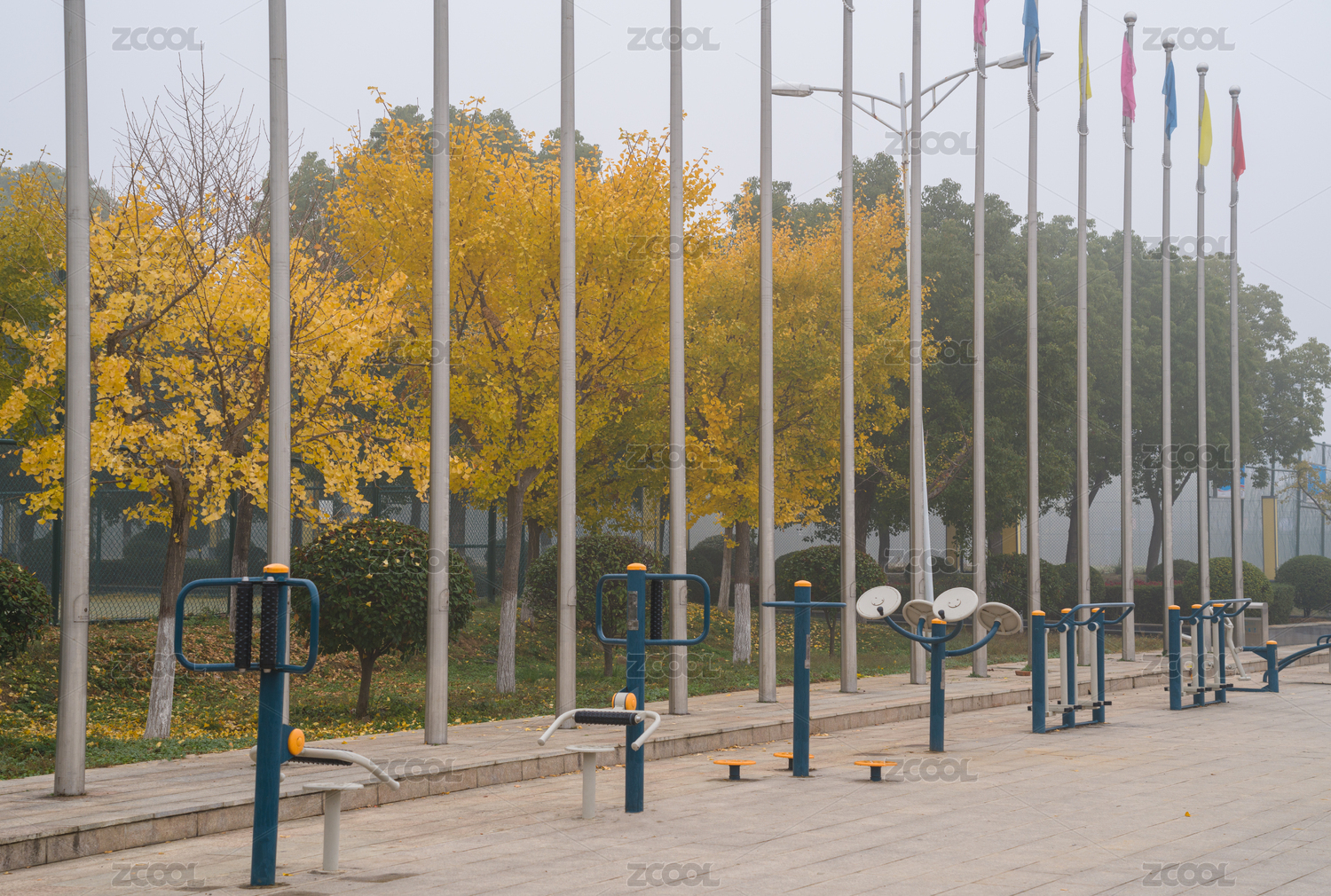 秋天早晨運(yùn)動(dòng)場(chǎng)邊的全民健身器材場(chǎng)地全景