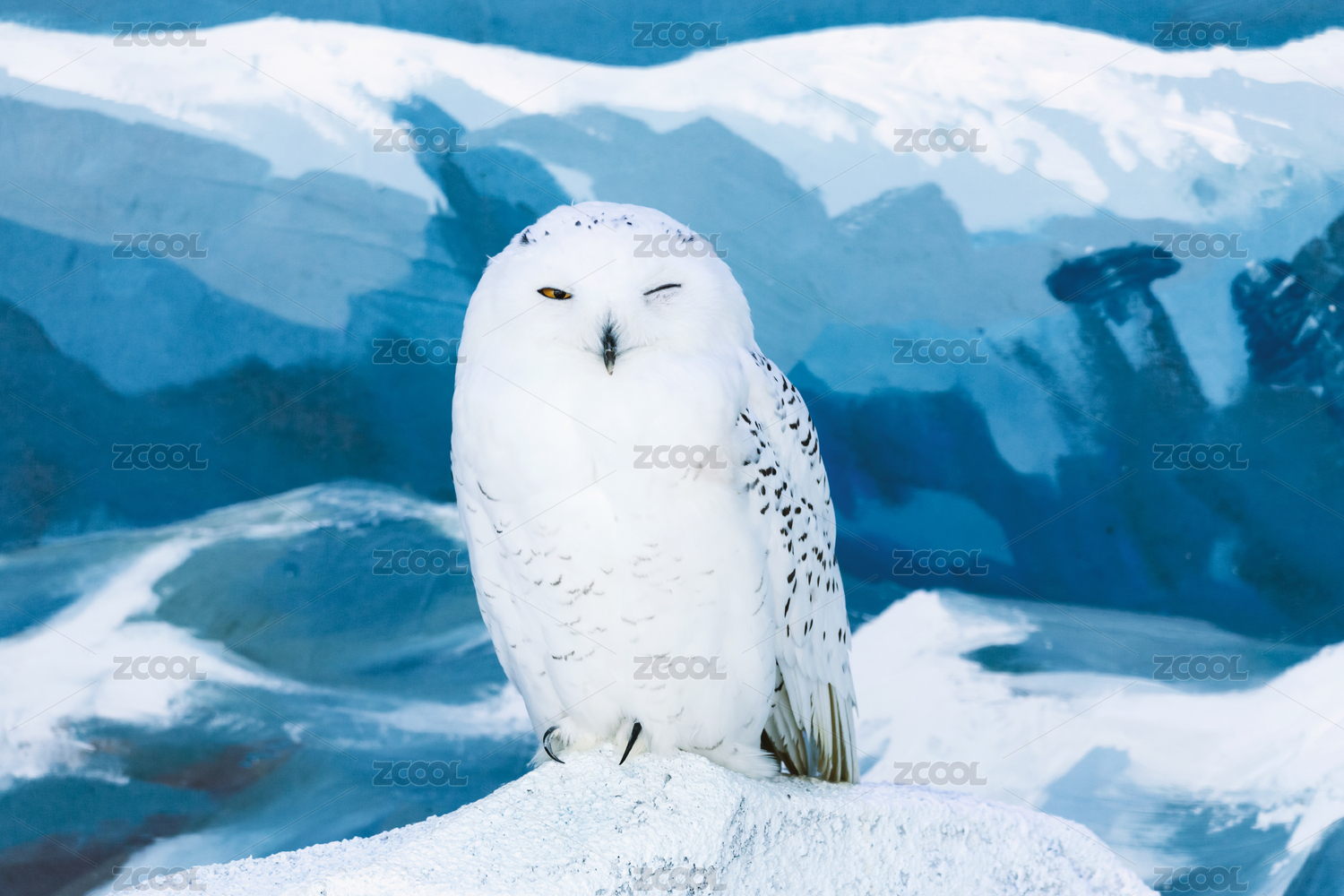 一只對鏡頭眨眼的可愛雪鸮全身照