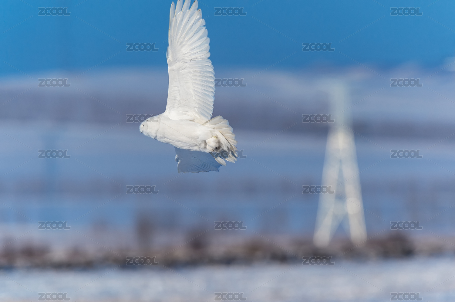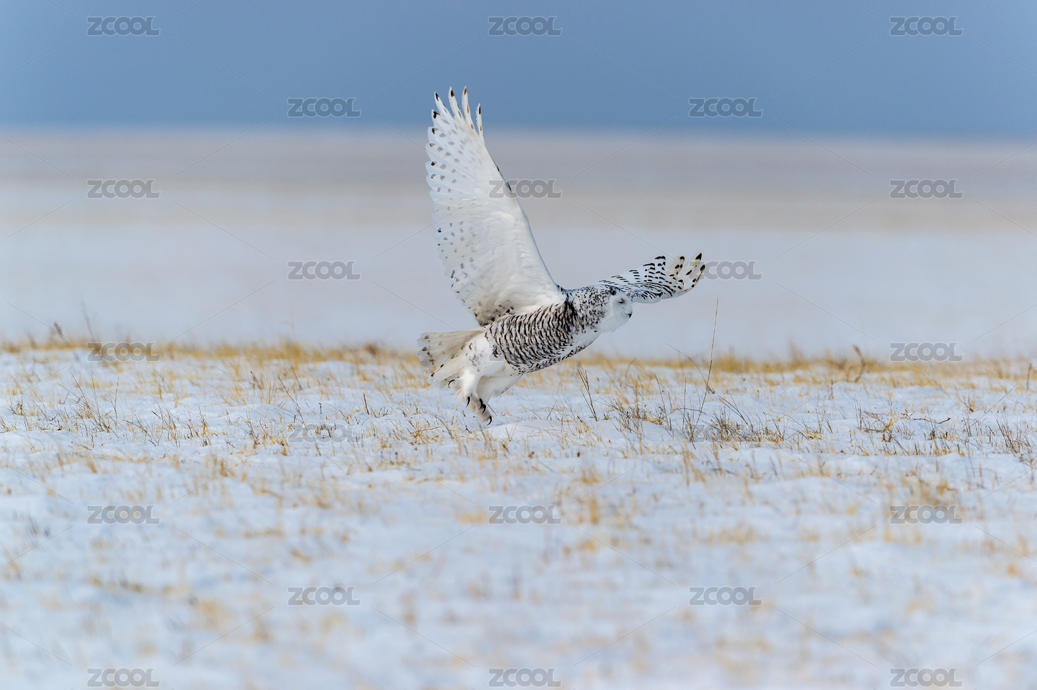 冬季一只野生雪鸮展翅飛翔