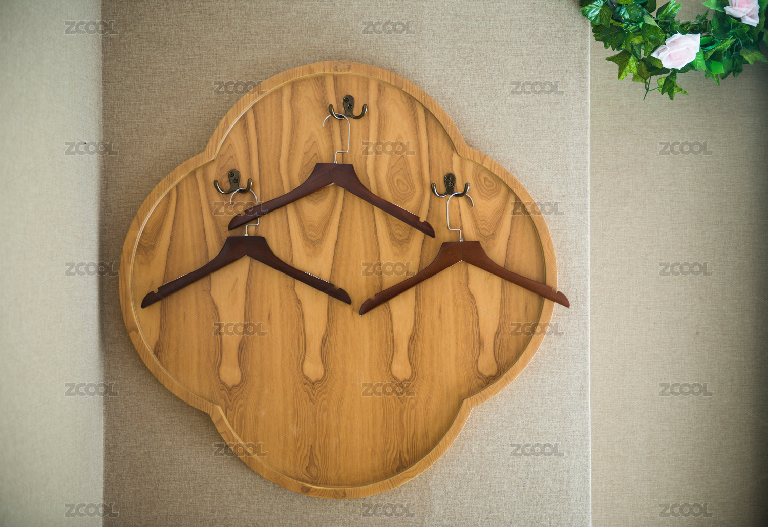 墻壁上的實木托盤裝飾和實木衣架