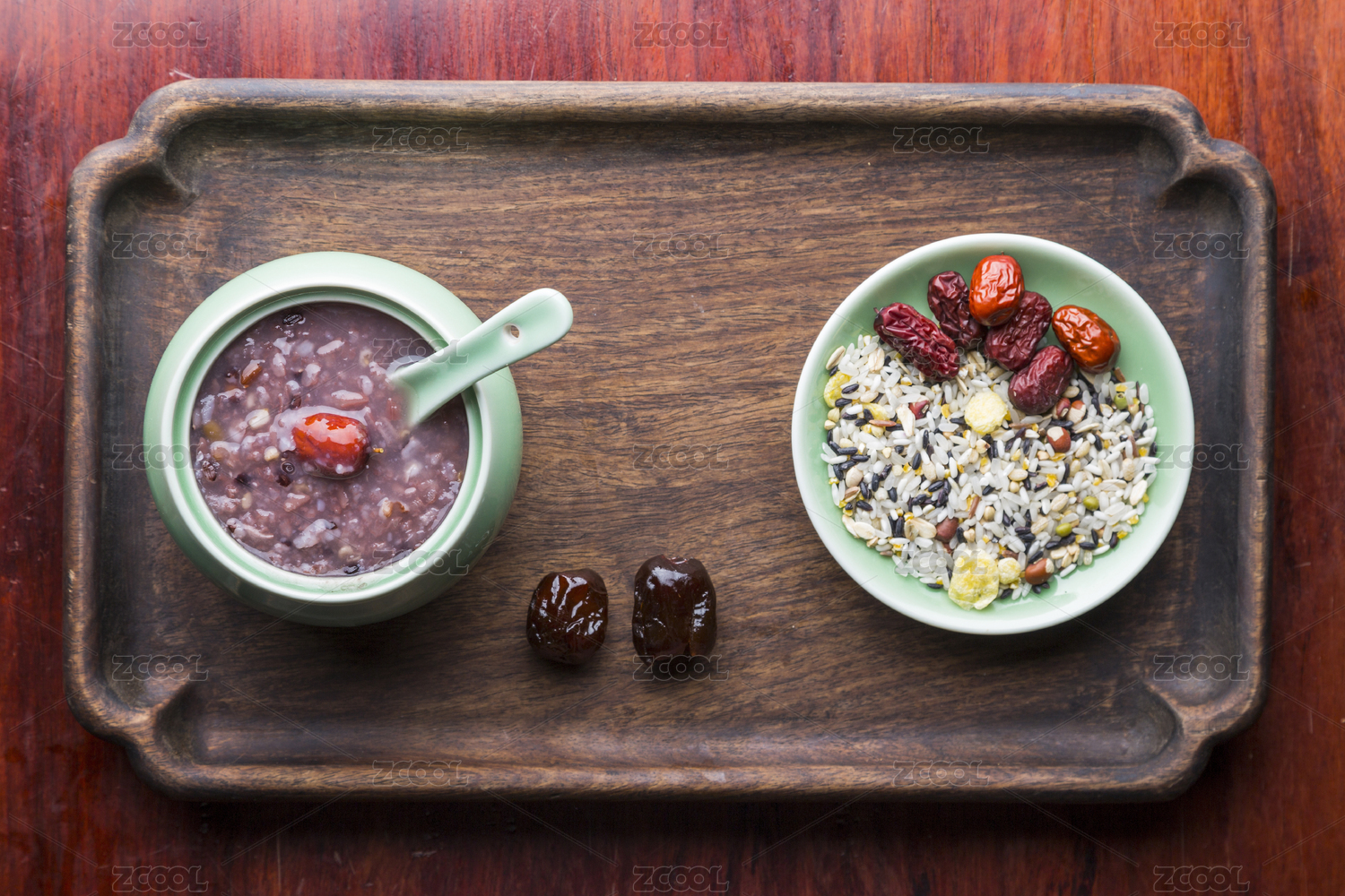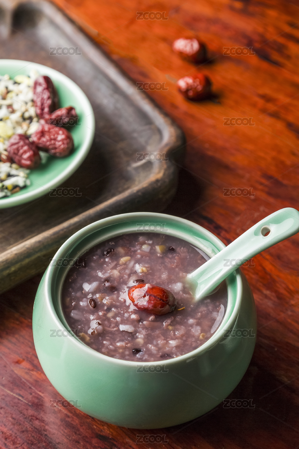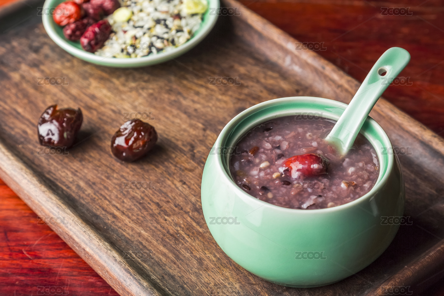 一碗紅棗薏仁養(yǎng)生粥放在復(fù)古實木托盤里