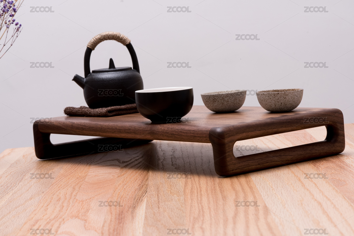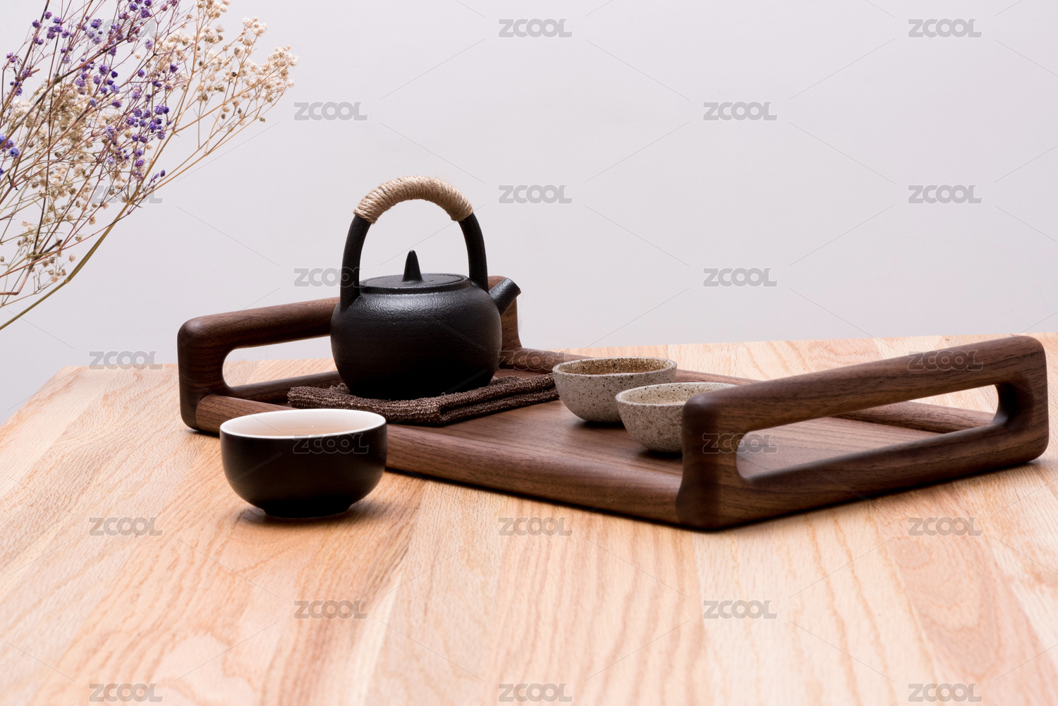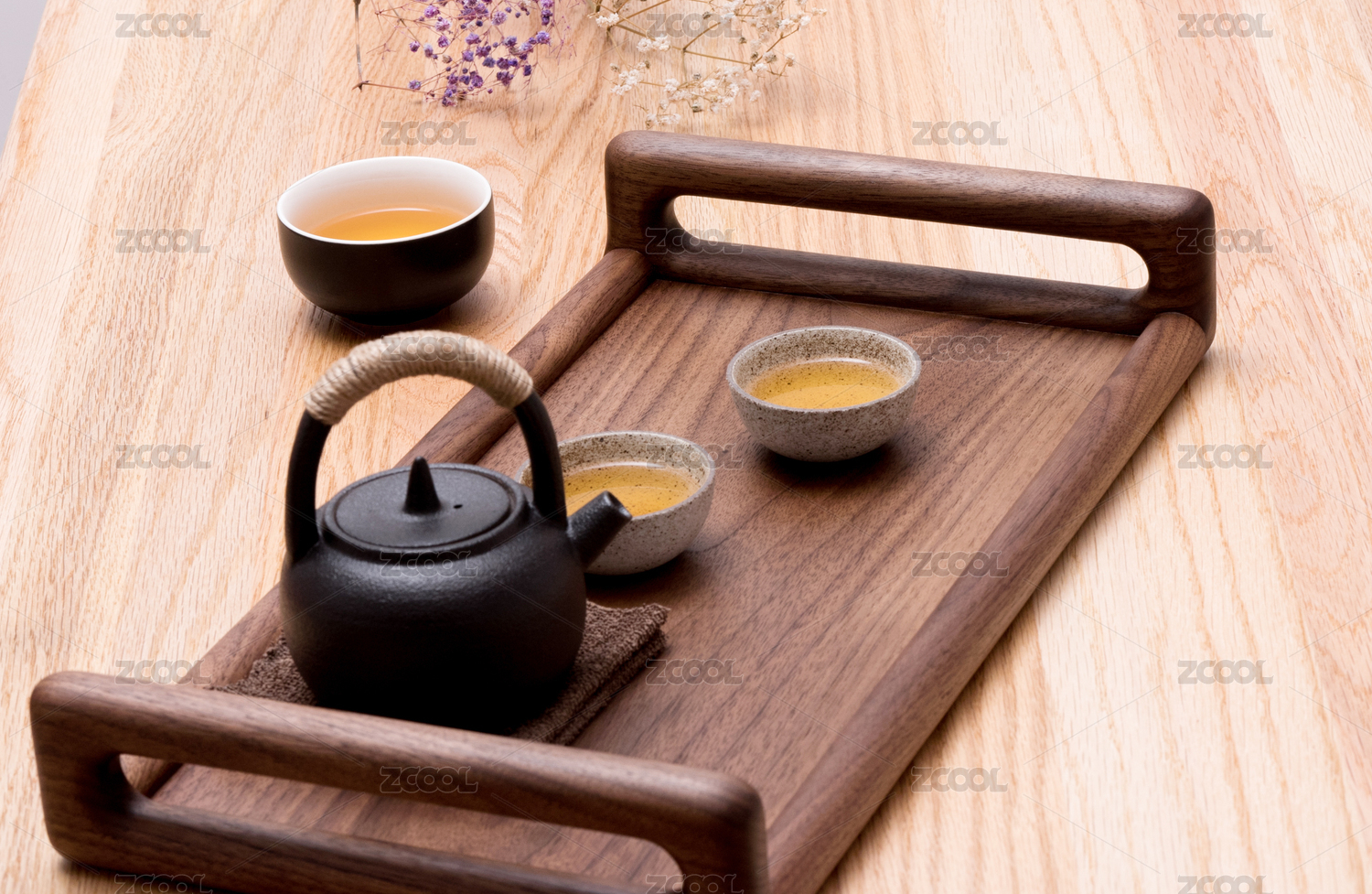 實木桌上搭配干花滿天星的黑色茶壺充滿茶水的黑色茶碗和淺色茶碗傳統(tǒng)茶具實木托盤
