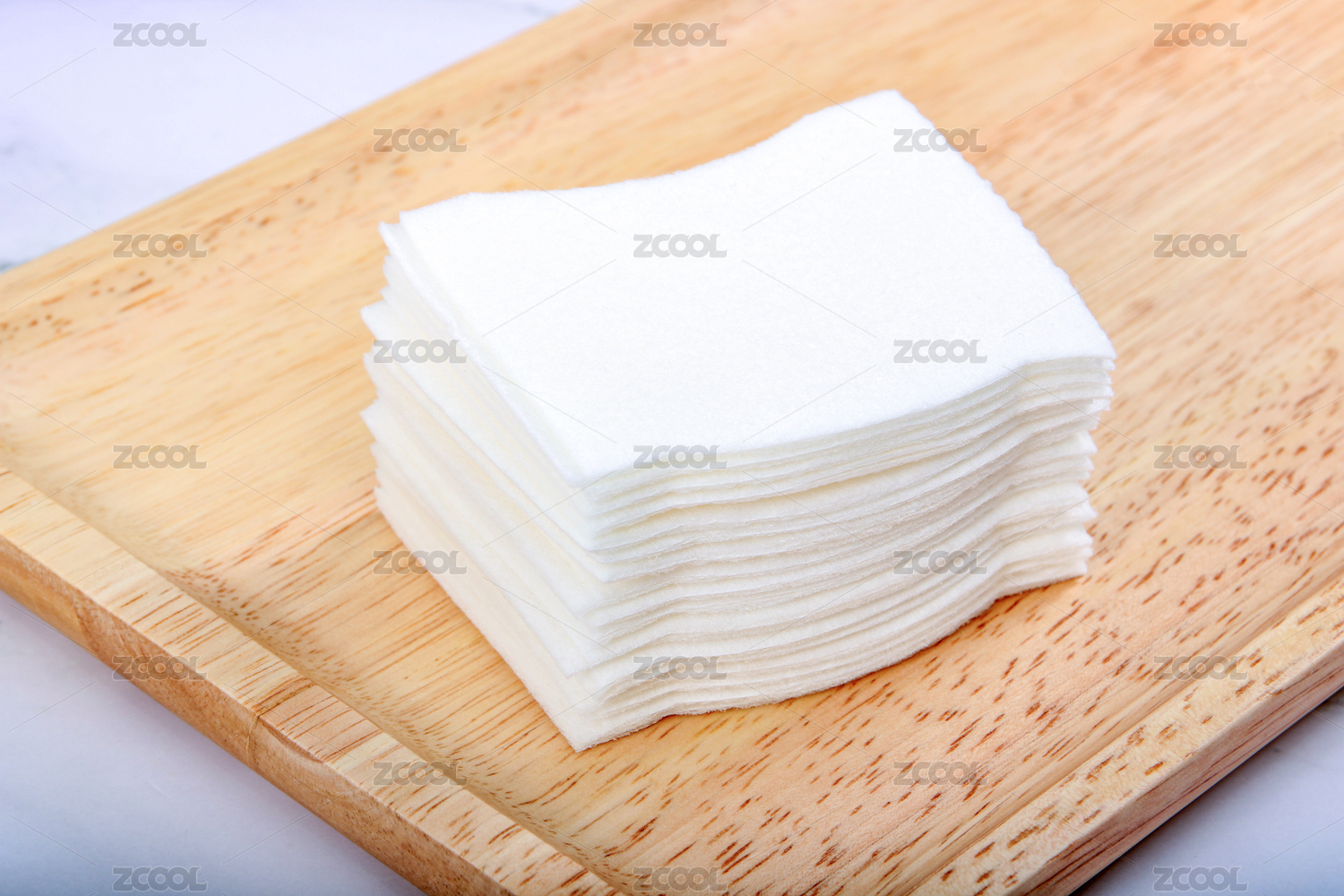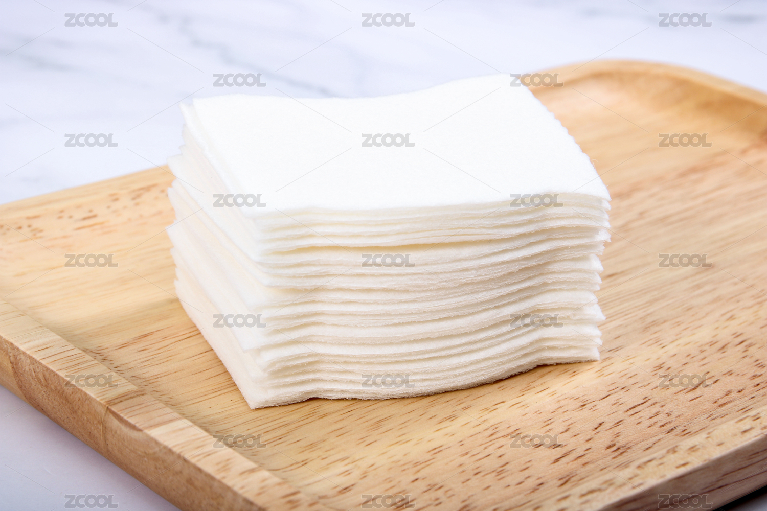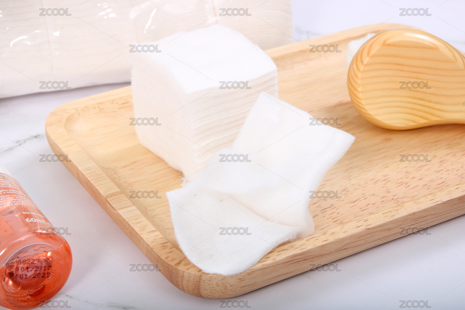 實木托盤上整齊擺放的白色化妝棉片