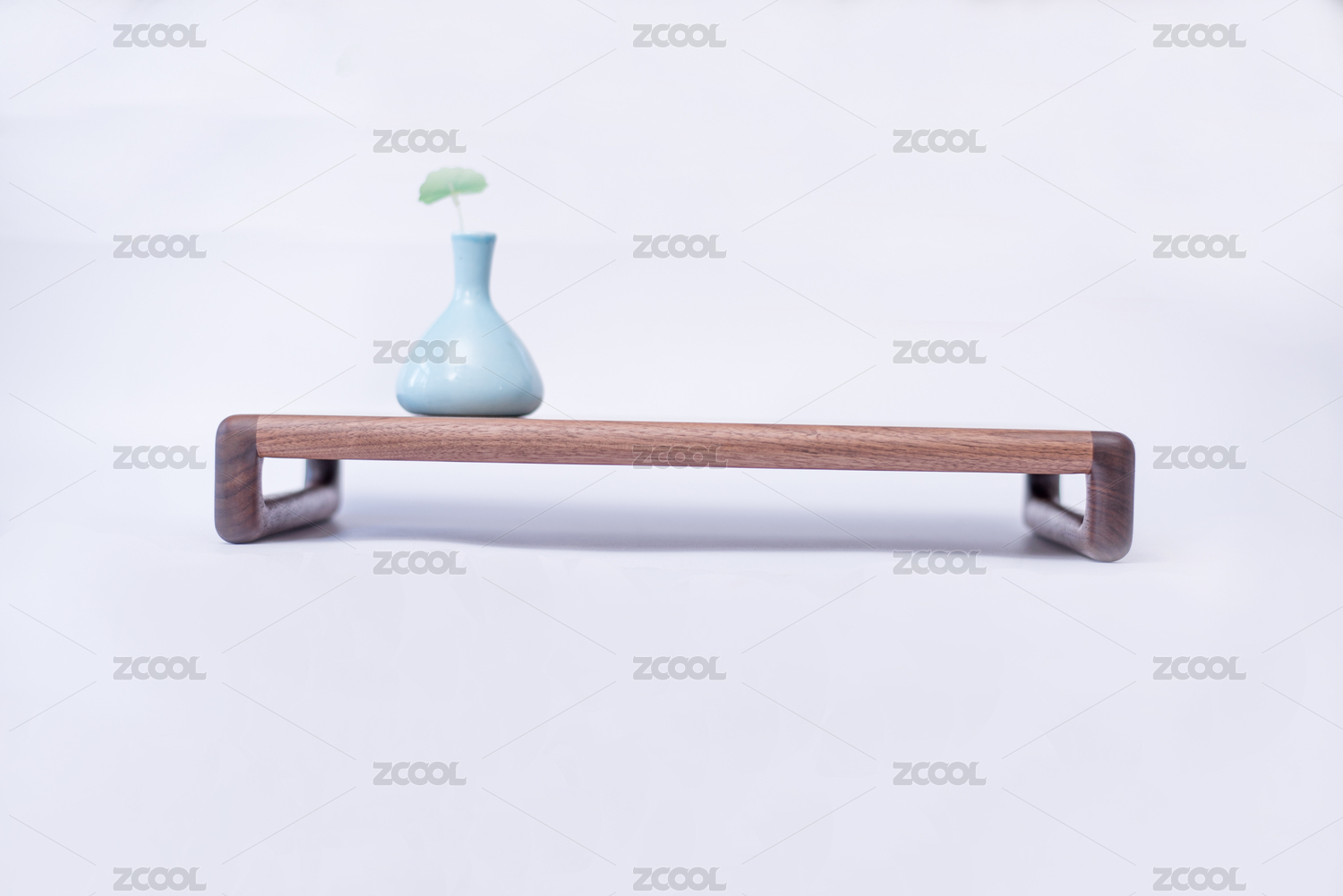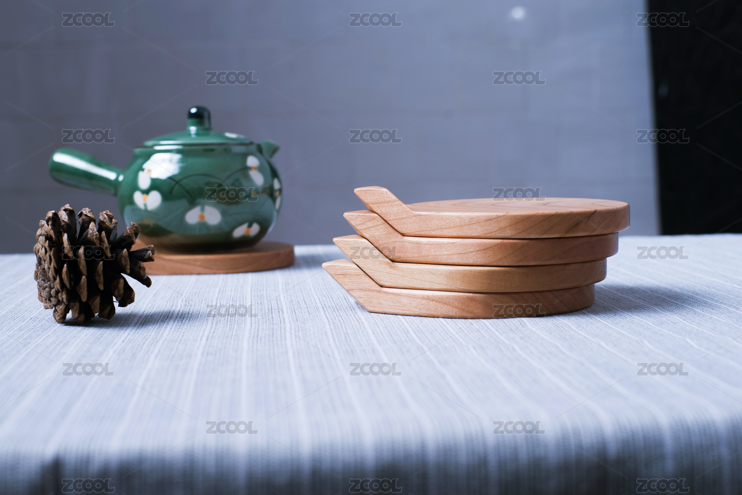 擺放淺藍色瓷瓶和綠色仿真荷花葉的傳統(tǒng)茶具實木托盤