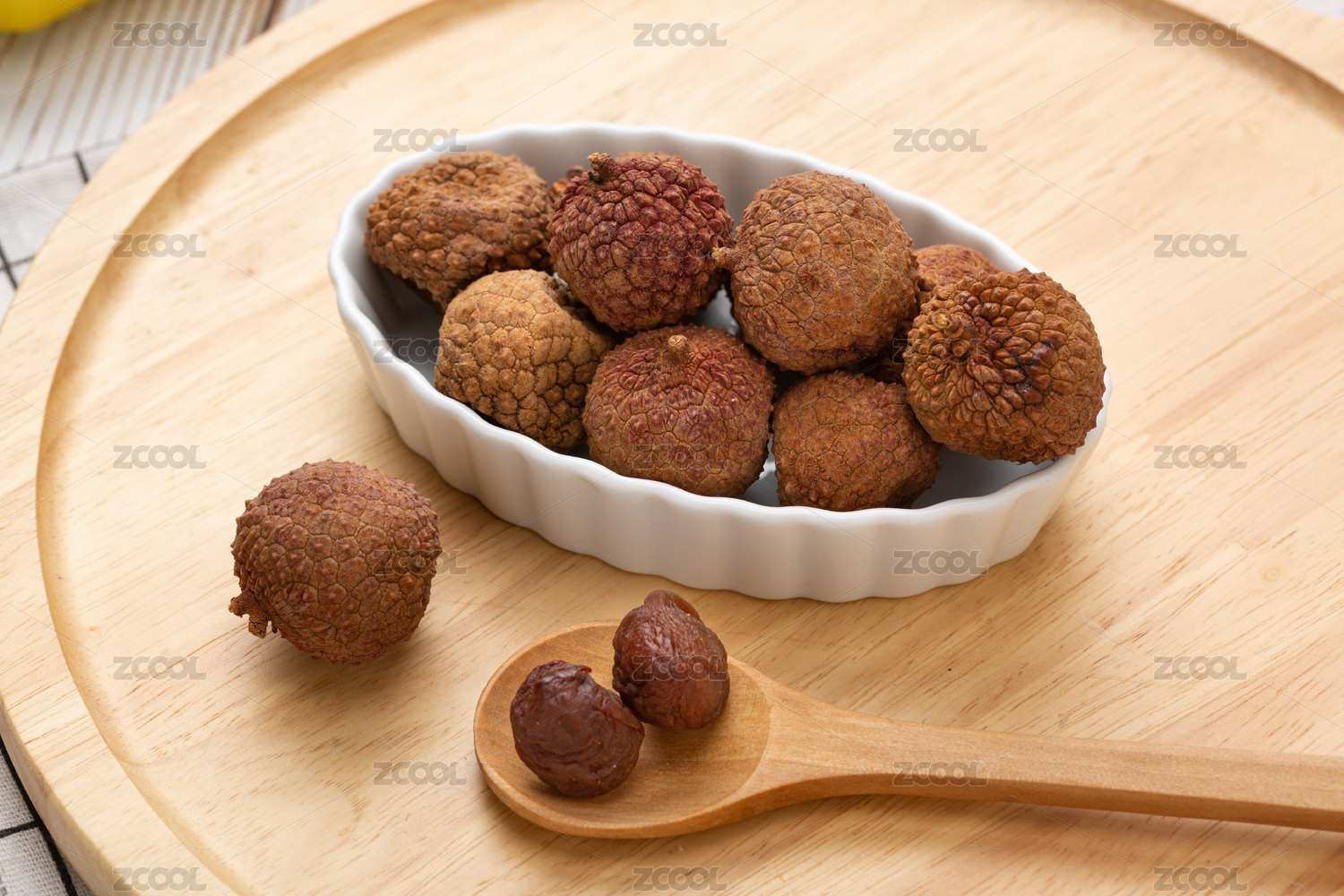 一碟荔枝干放在實木托盤上
