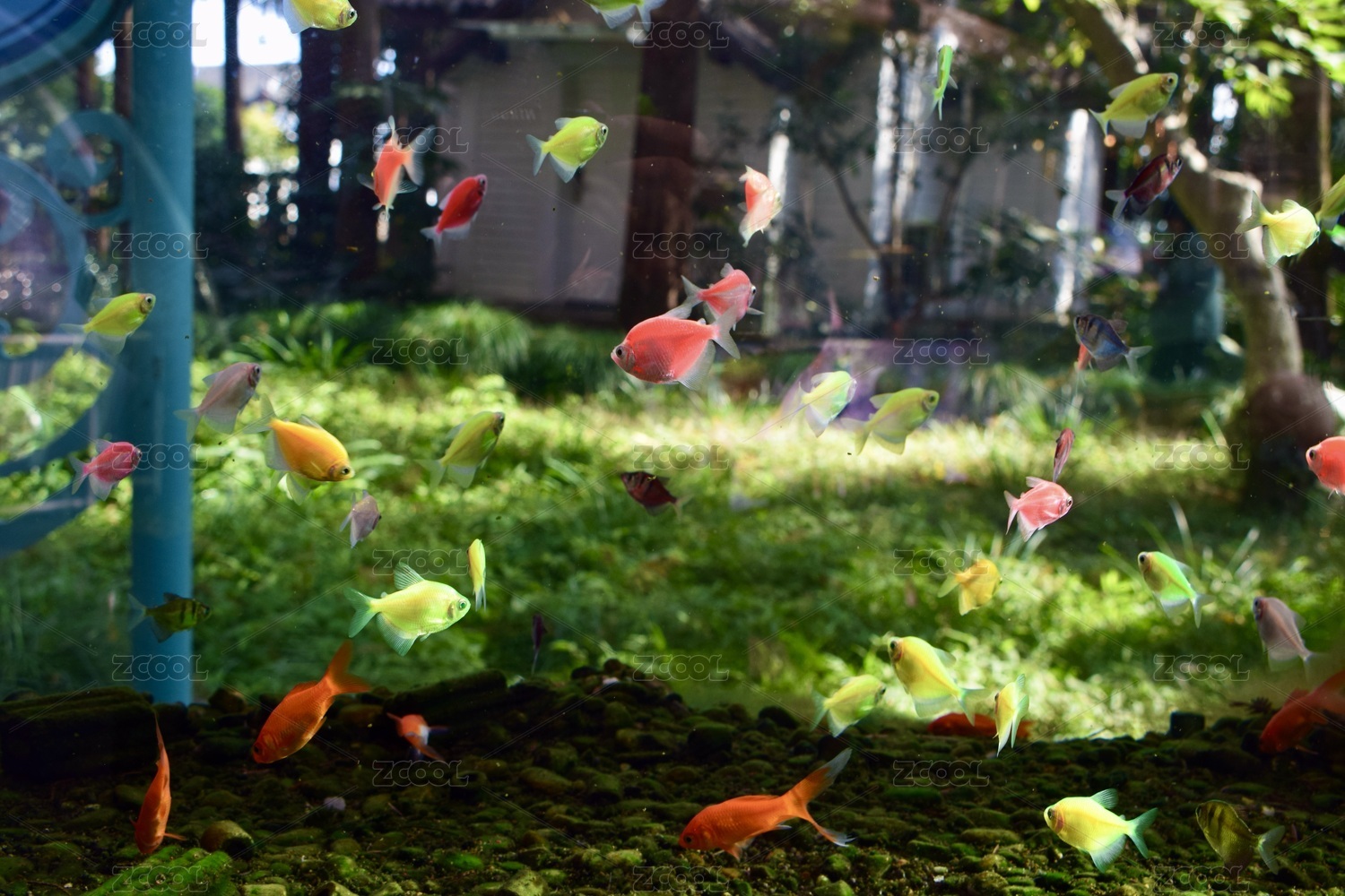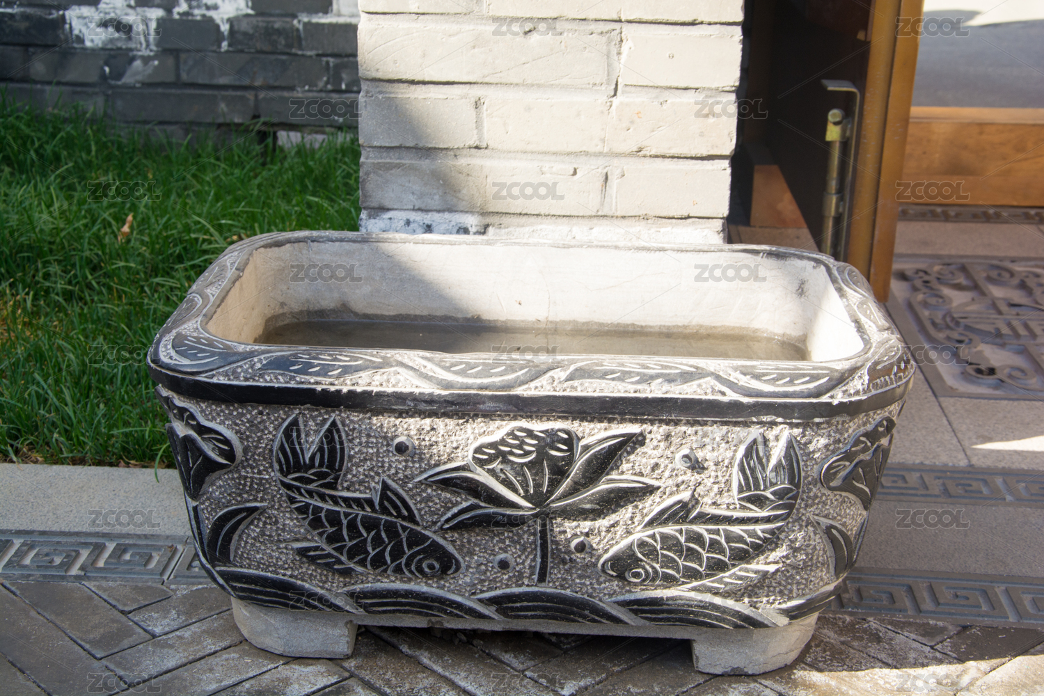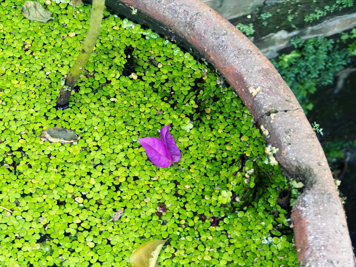 一個(gè)古法養(yǎng)魚缸里長滿了綠藻