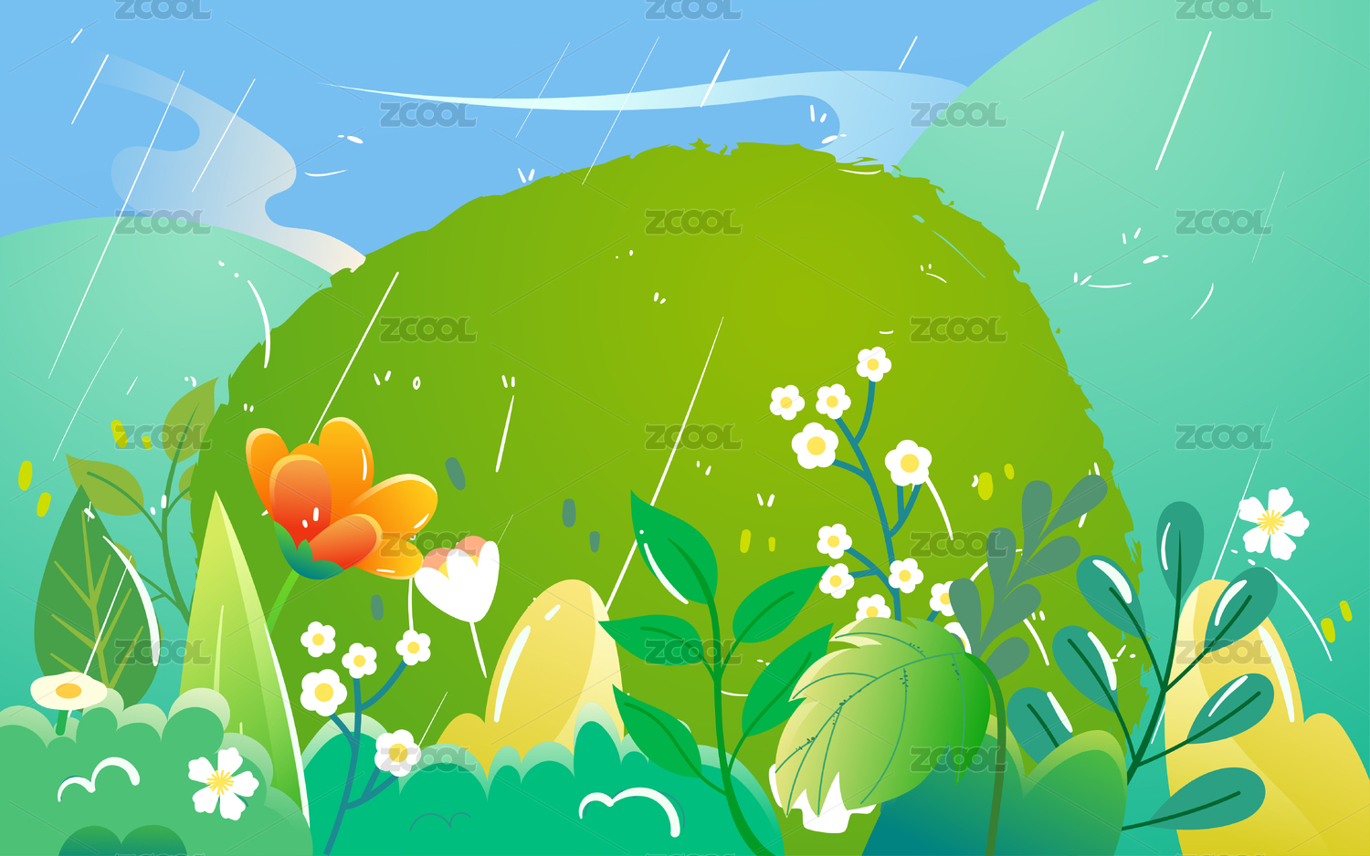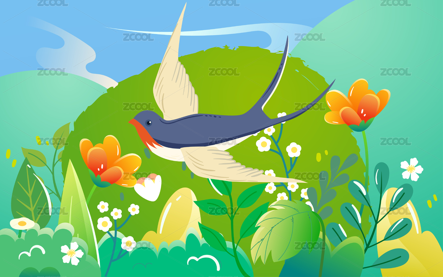 雨水節(jié)氣插畫春天下雨燕子飛翔植物生長海報
