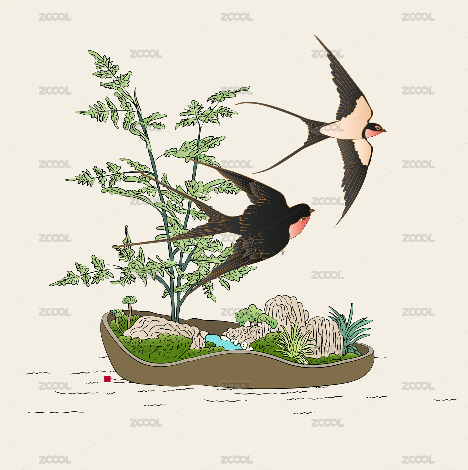 古風(fēng)春季園林盆景雨燕中國風(fēng)矢量手繪插畫