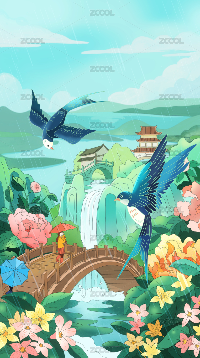 清明谷雨微雨燕雙飛風(fēng)景插畫