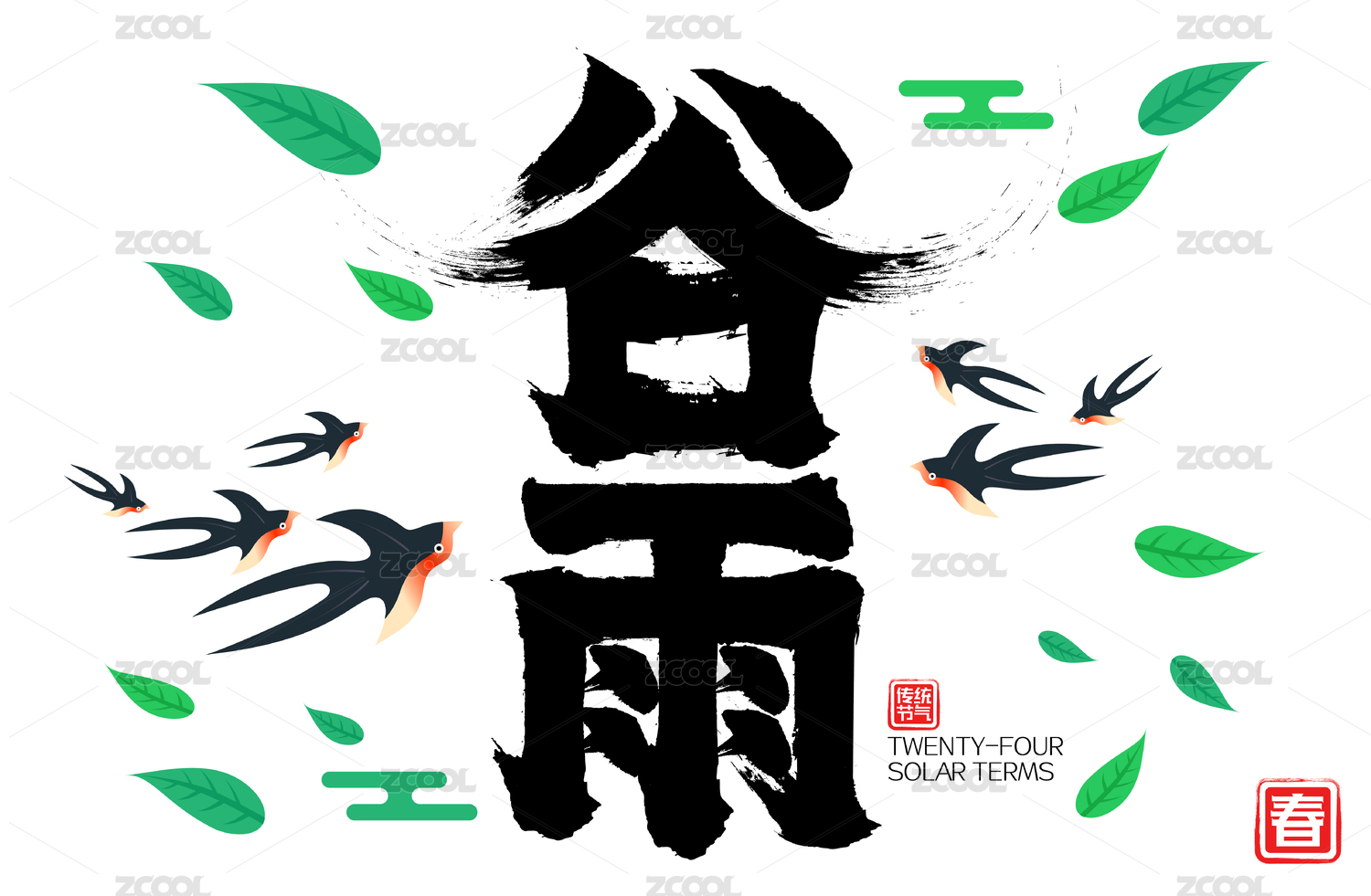 谷雨燕子飛舞樹葉飄飛歡慶春天矢量毛筆字