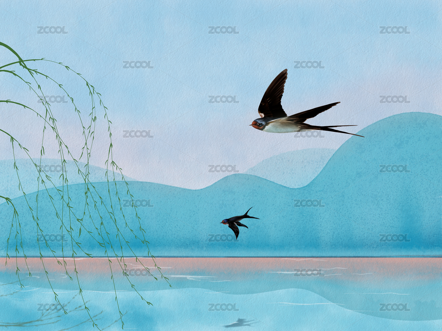 水彩風(fēng)格的春季兩只燕子歸來插畫