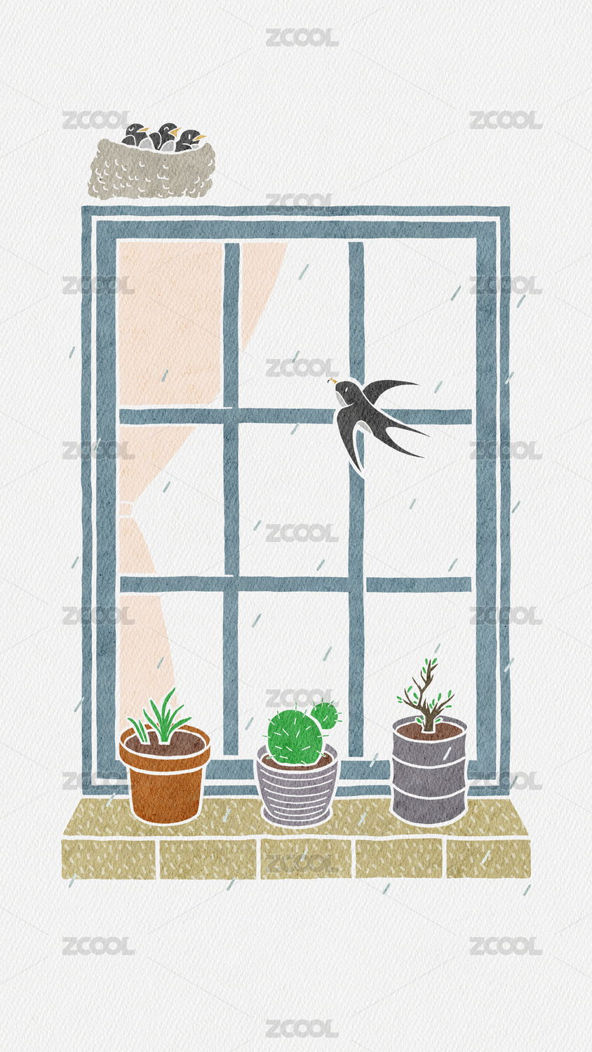 扁平風(fēng)紙質(zhì)肌理窗邊風(fēng)景春雨燕子