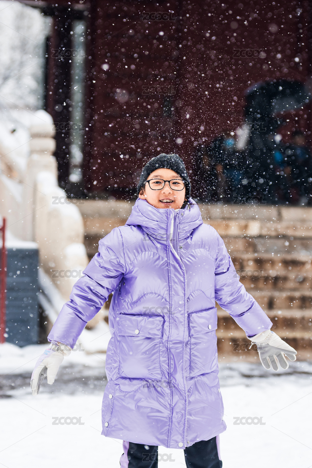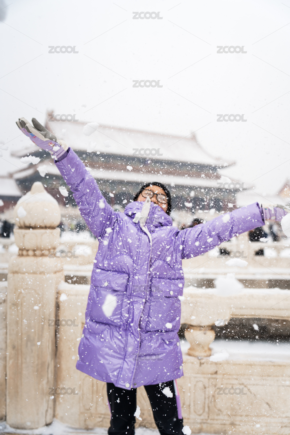 女孩在北京故宮內(nèi)雪中伸手嬉戲