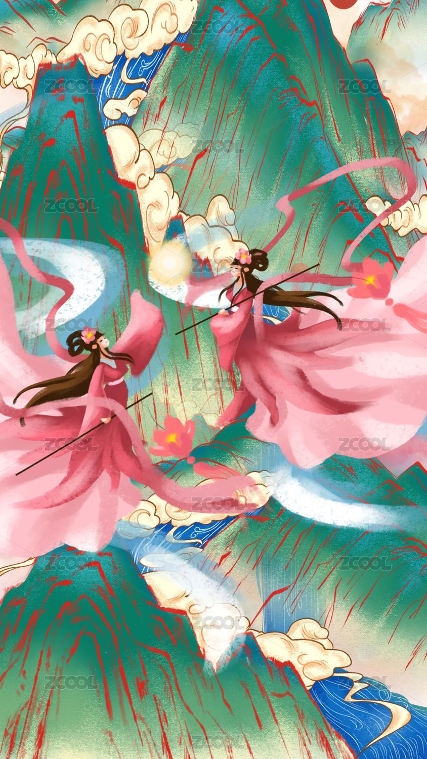 水墨紙紋兩唐朝胖仕女面對面嬉戲