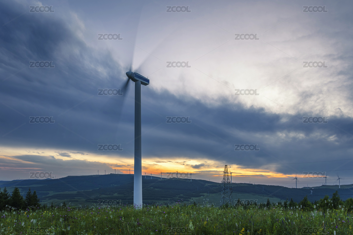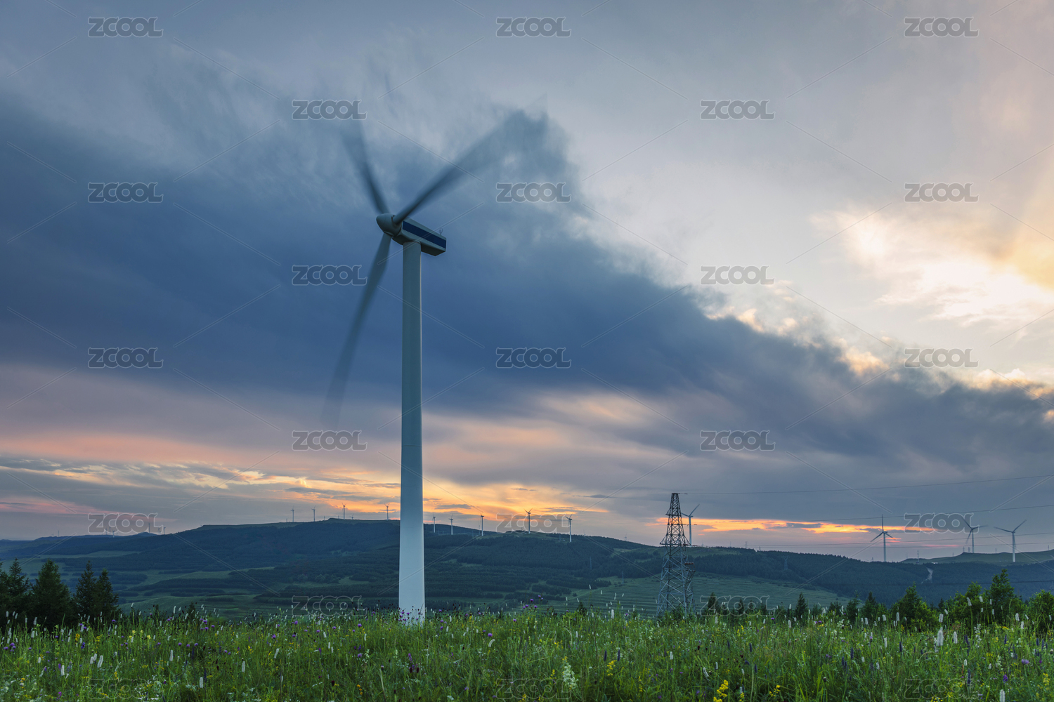 夏季草原上旋轉(zhuǎn)的風(fēng)電機(jī)組