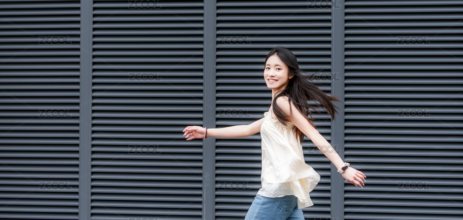 青春洋溢的女孩在墻前旋轉(zhuǎn)