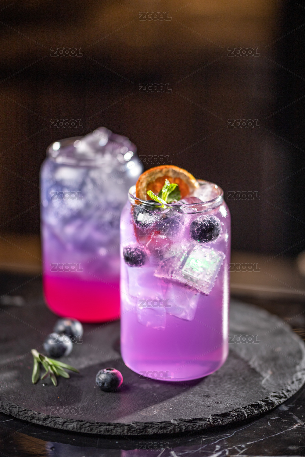 暗色桌面上放著一杯紫色雞尾酒