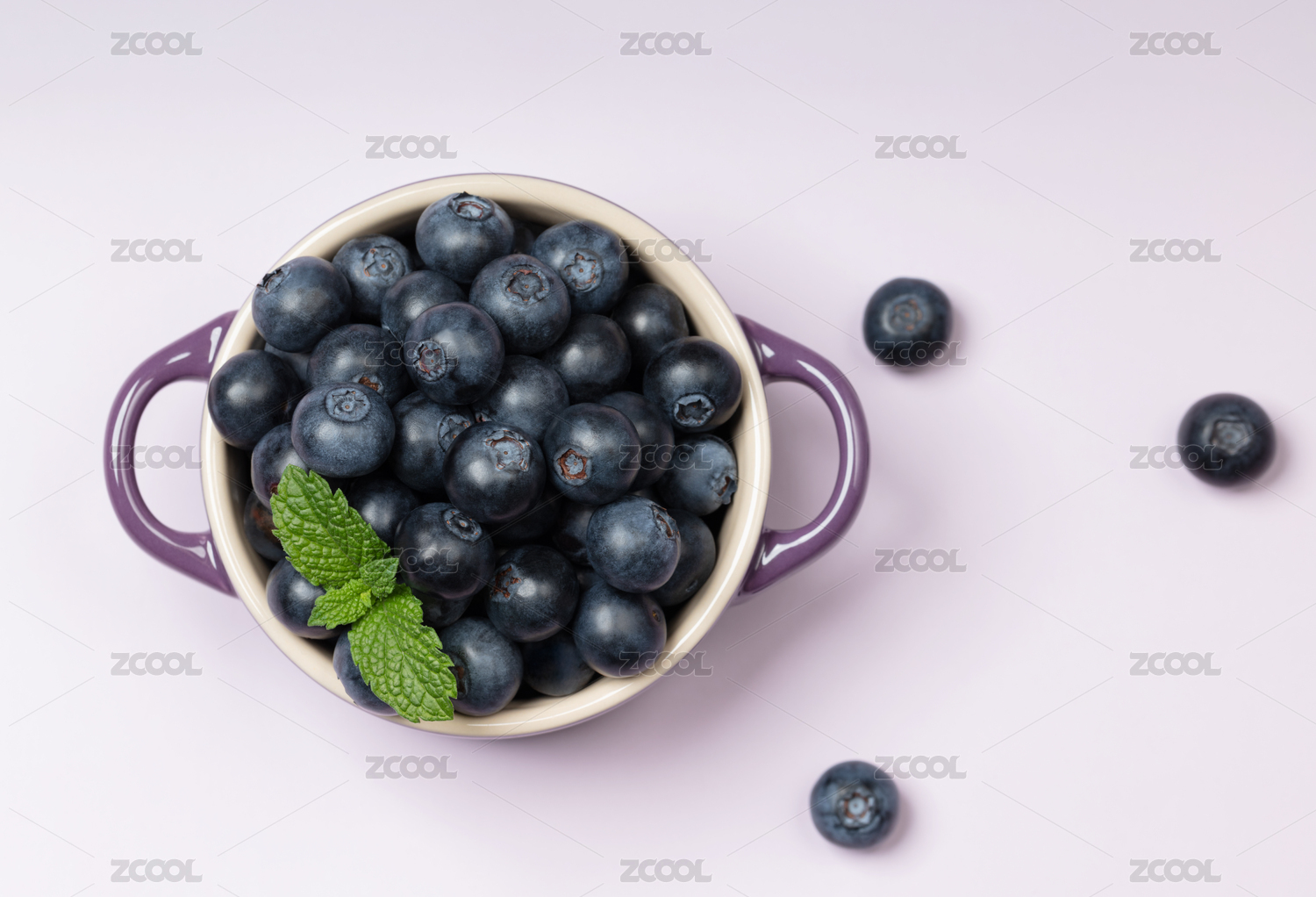 紫色背景紫色碗中的藍莓