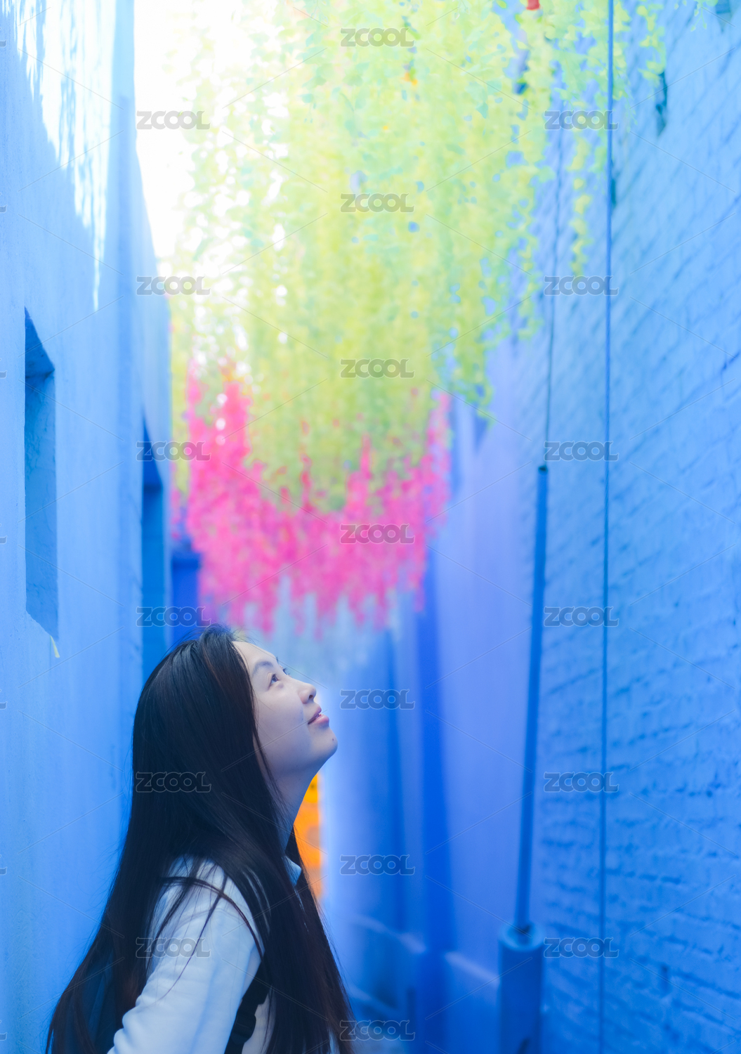 中國女性在中國新疆庫車城市的藍色街道游玩