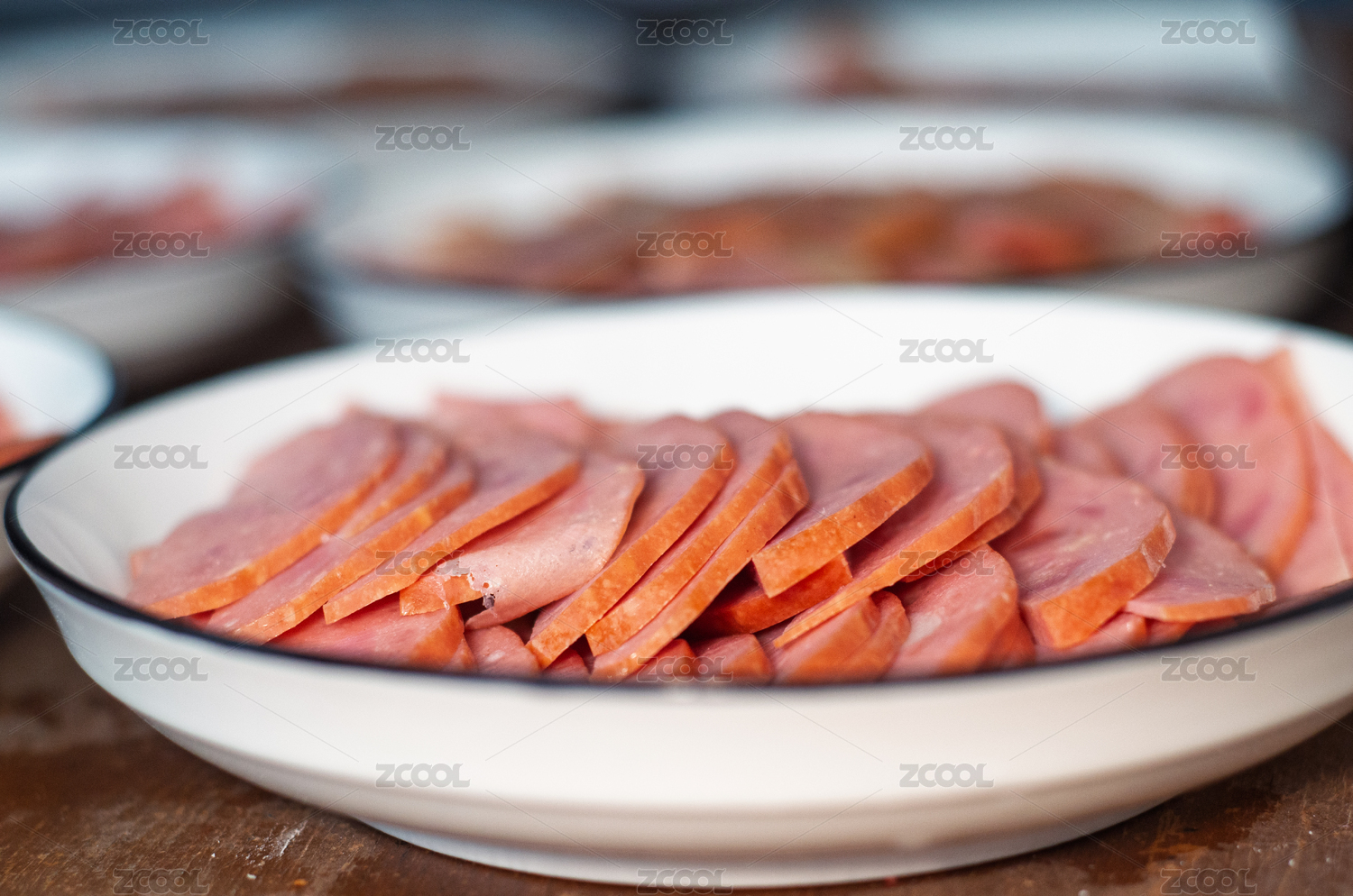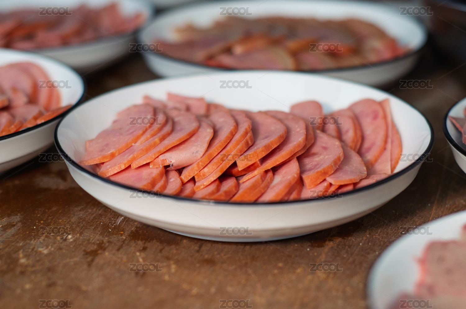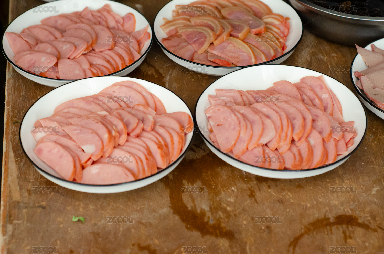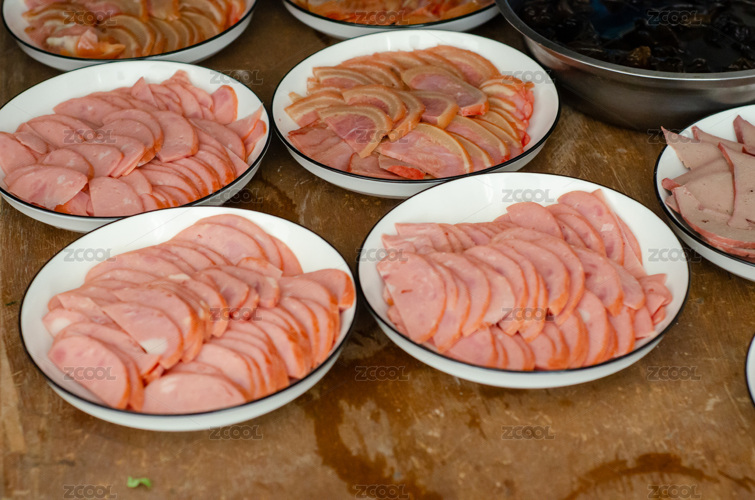 木桌上擺放的多盤切片火腿