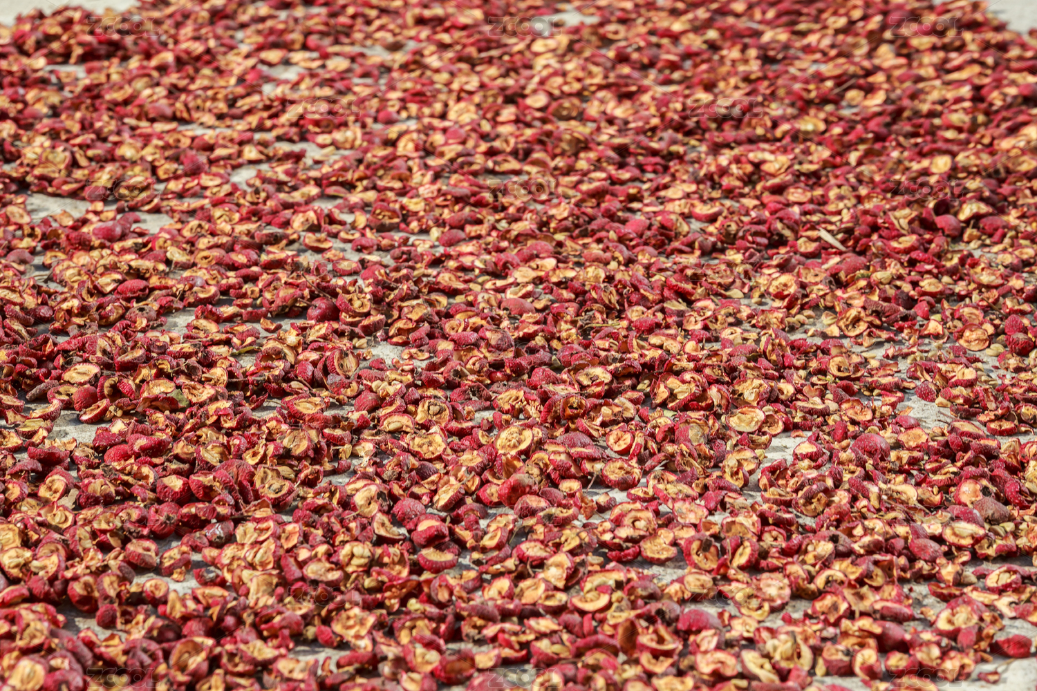 地面上晾曬的紅色的山楂切片