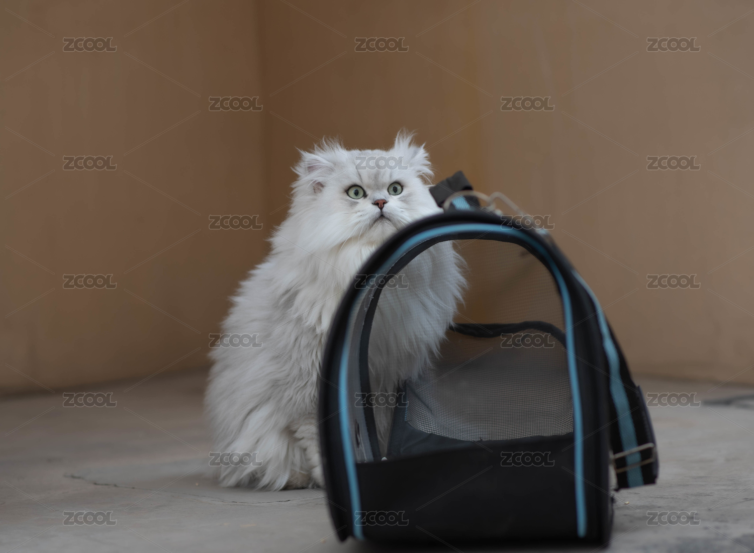 一只看著黑色貓包的金吉拉長毛貓昂首挺胸