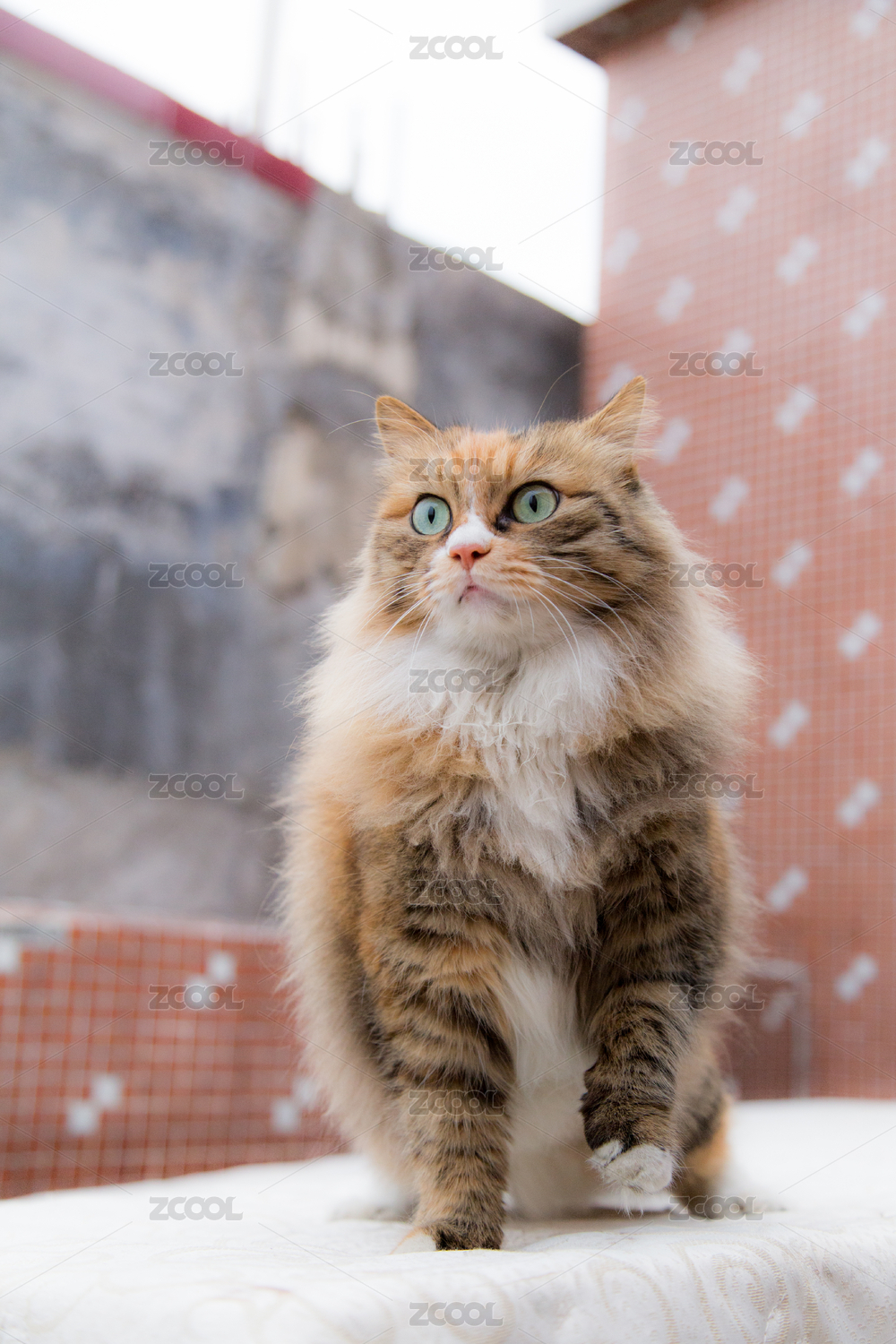 在天臺(tái)上抬著頭坐著的金吉拉長毛貓上半身