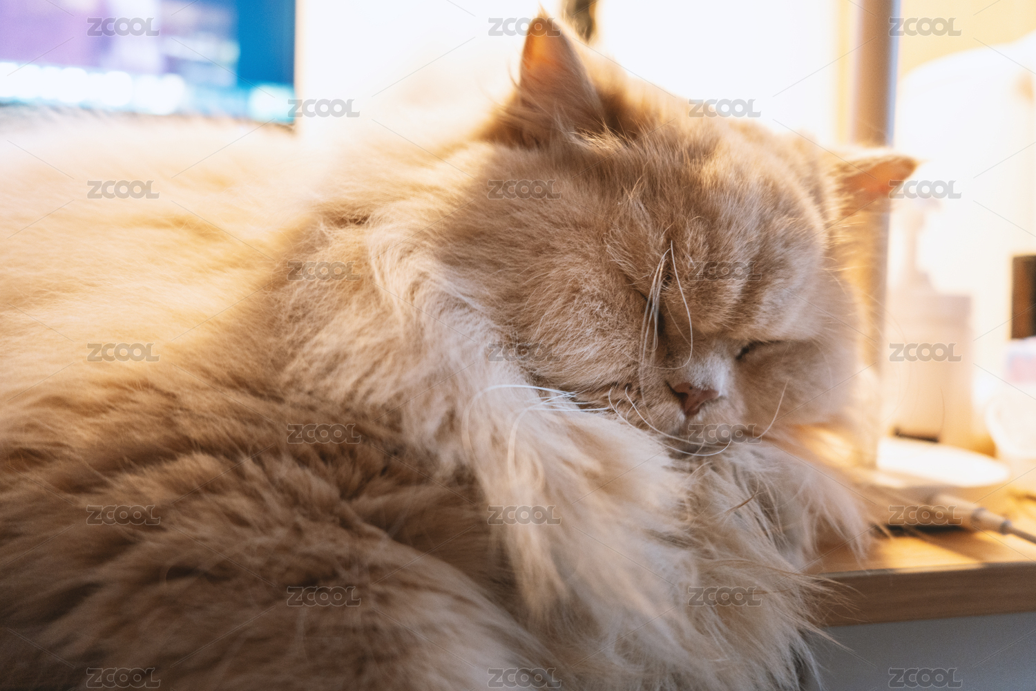 英國長毛貓?zhí)稍诠ぷ髯郎峡恐_(tái)燈睡覺