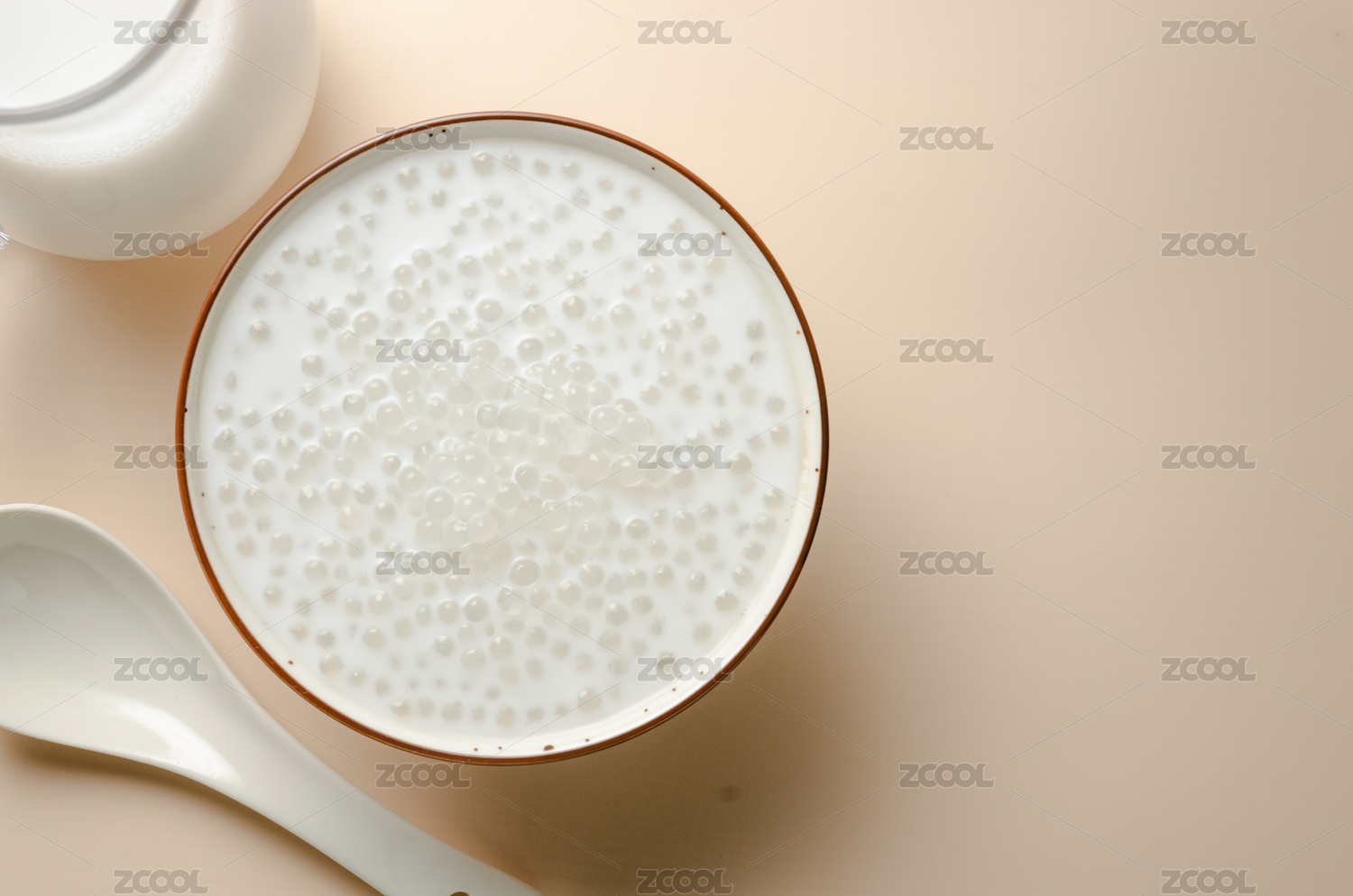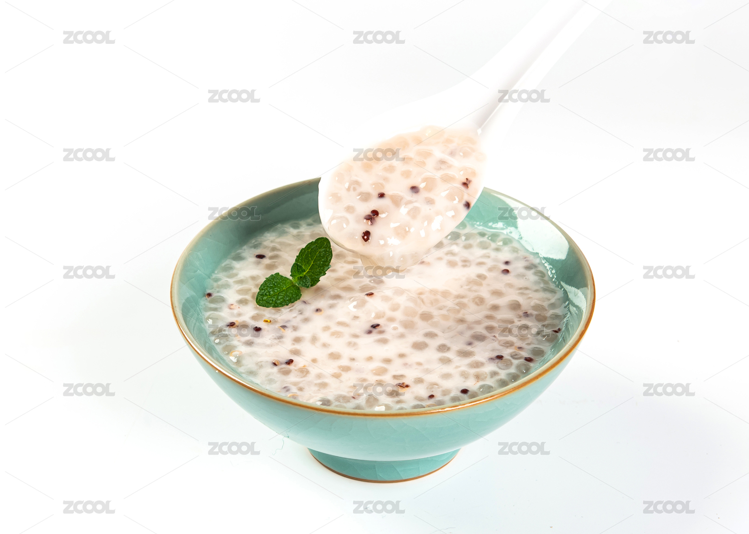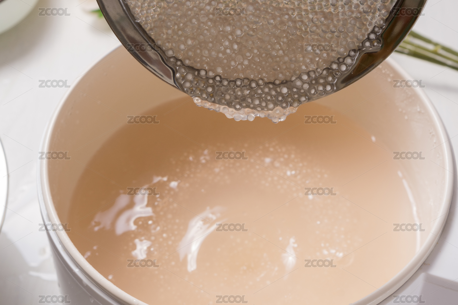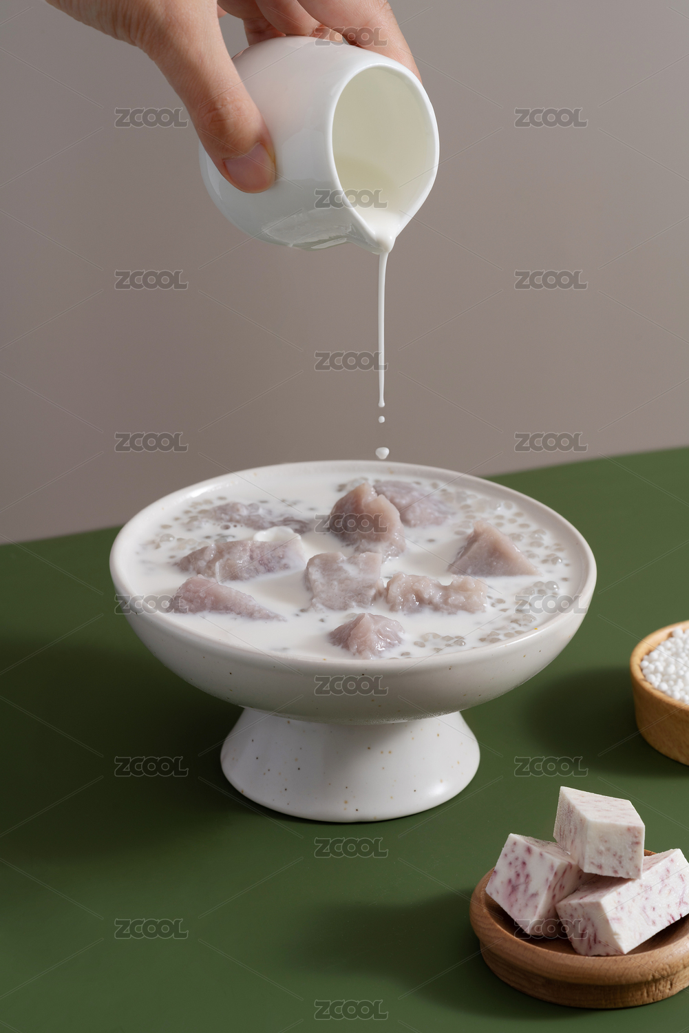 人手拿著奶壺往一碗香芋西米露中倒牛奶