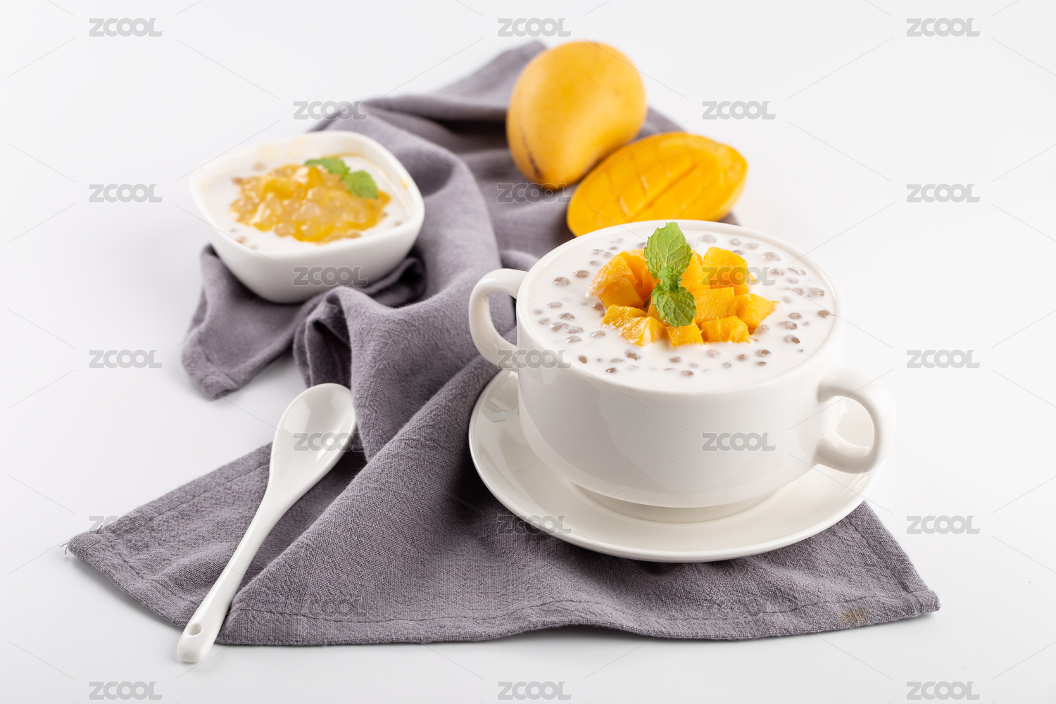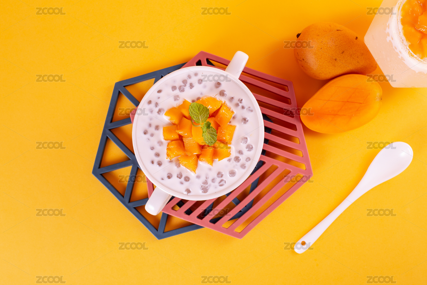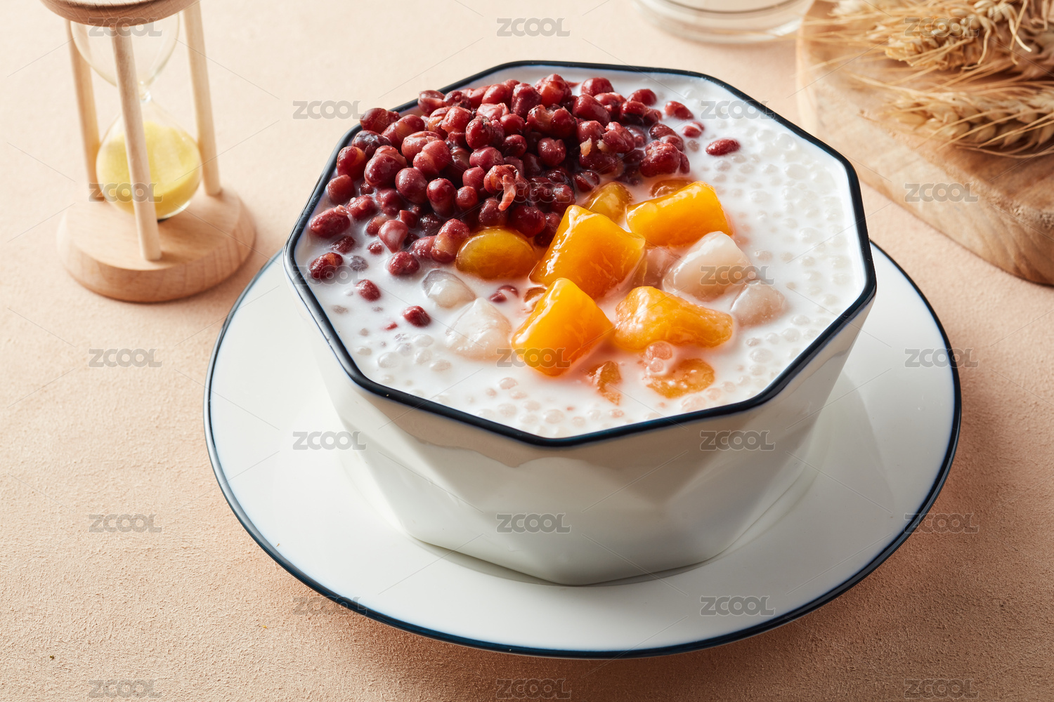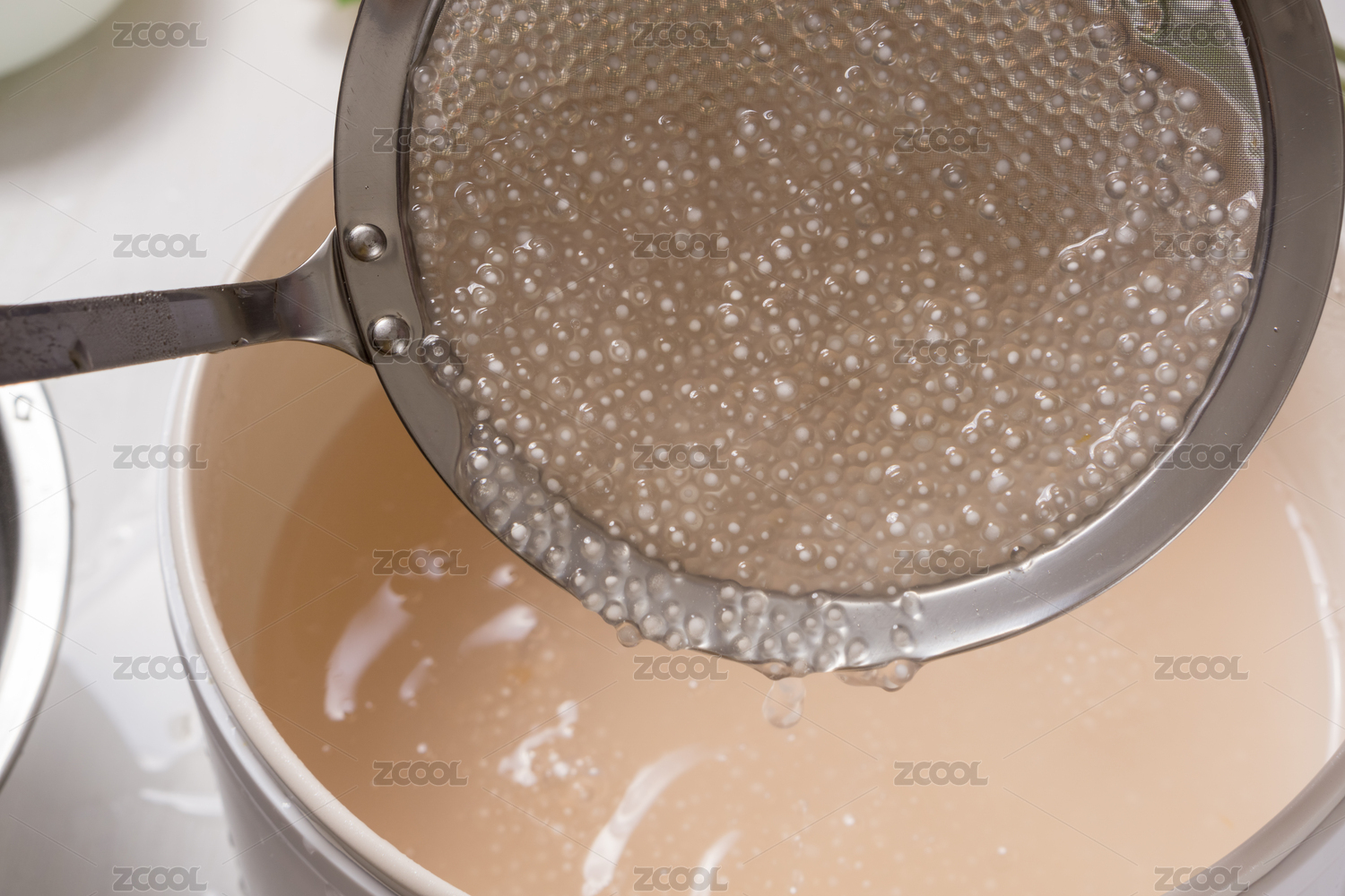 人手拿著奶壺往一碗香芋西米露中倒牛奶