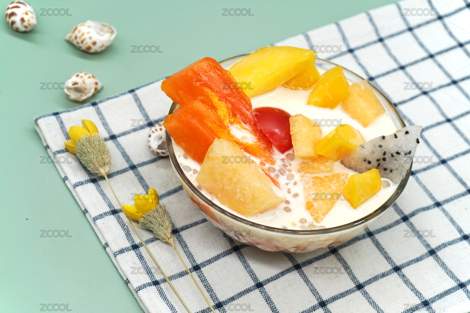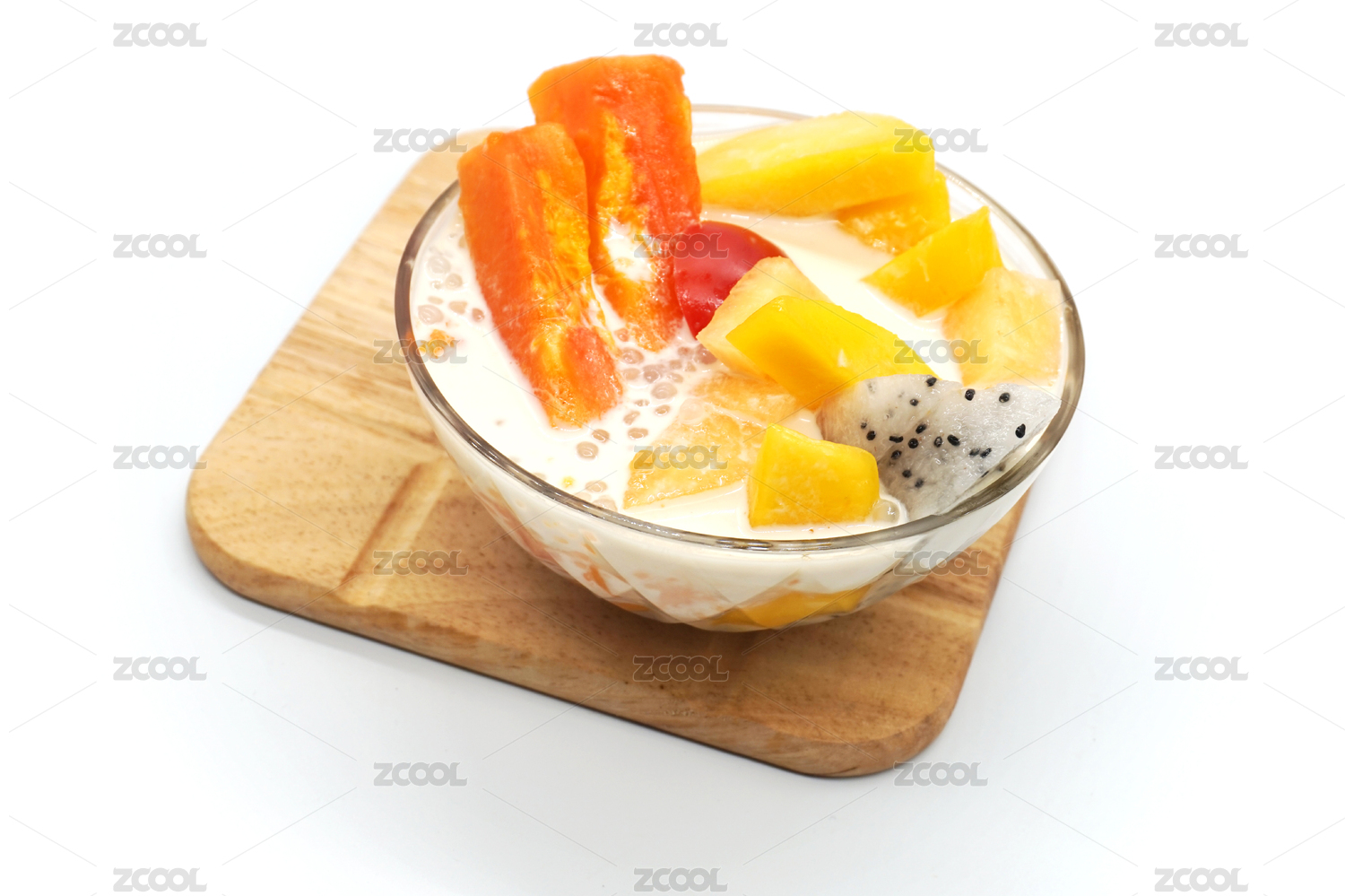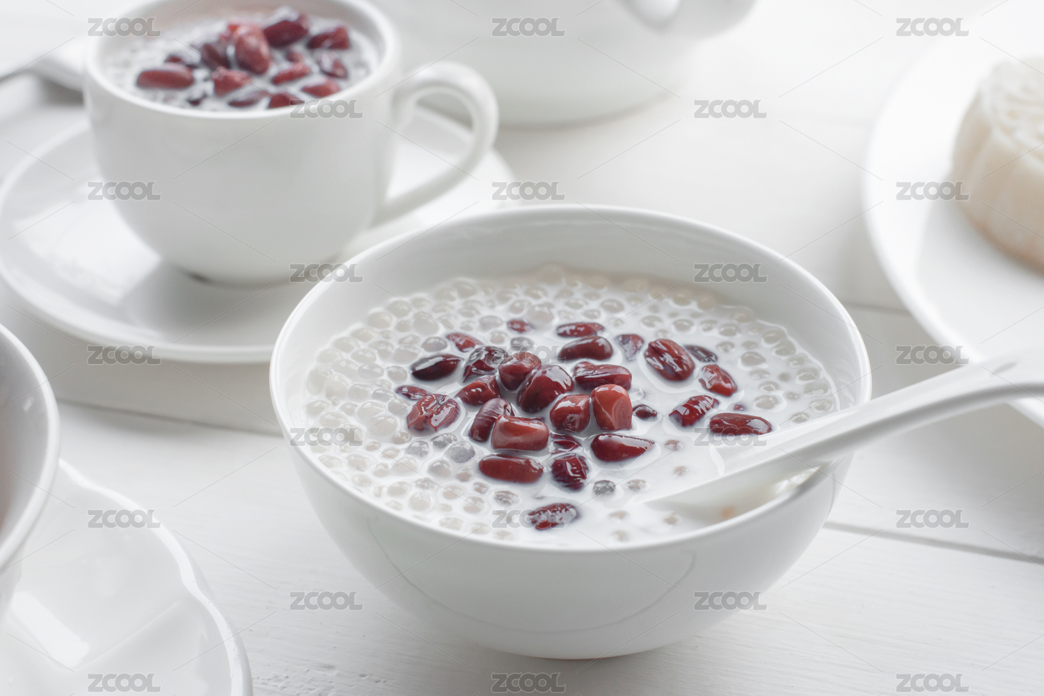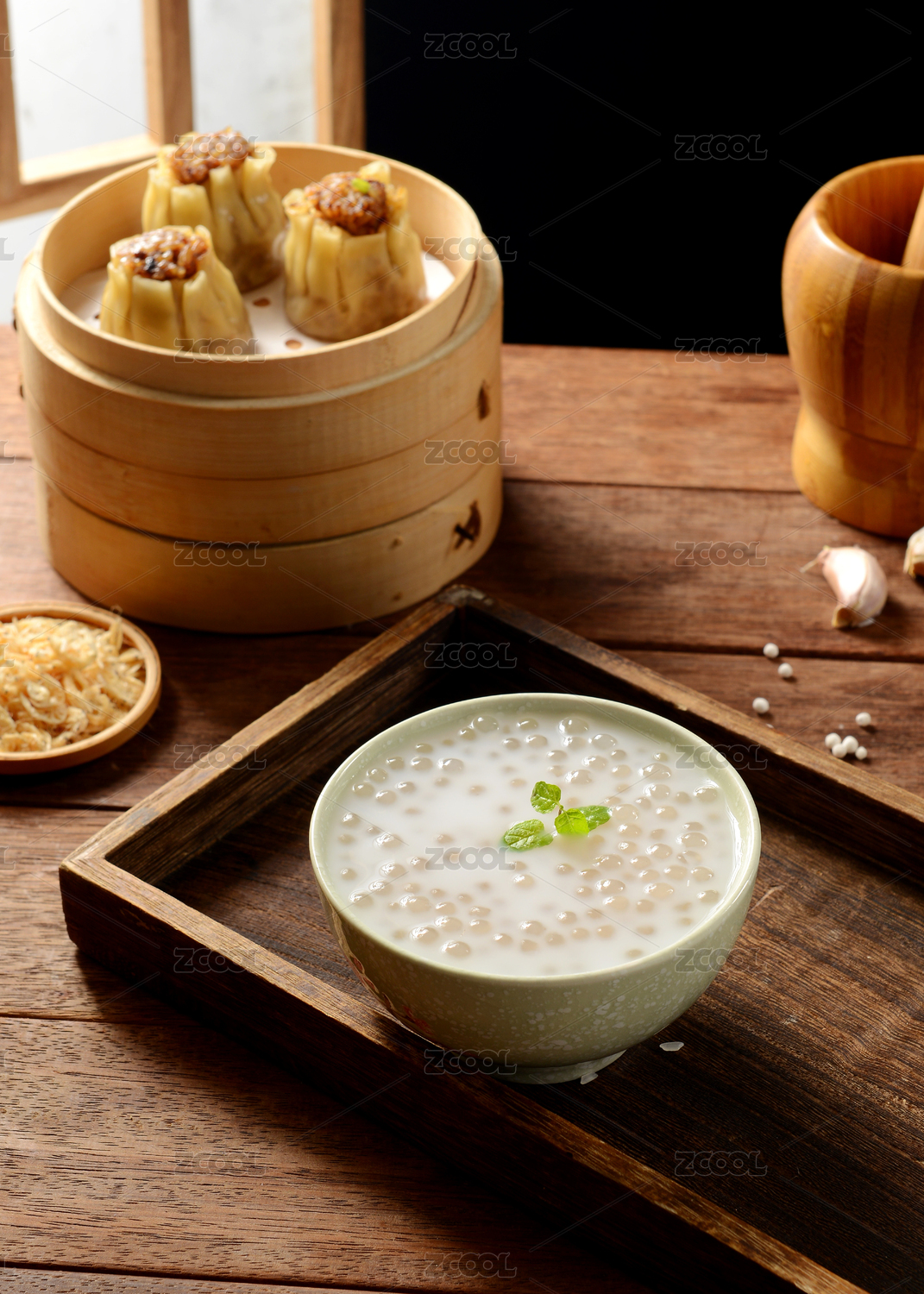 人手拿著奶壺往一碗香芋西米露中倒牛奶