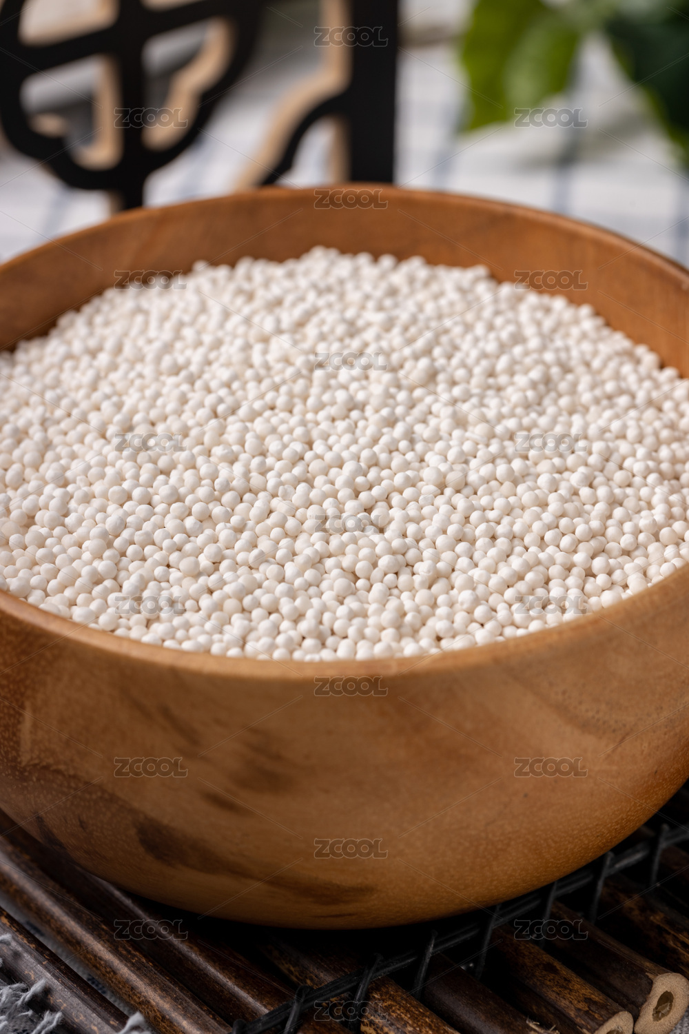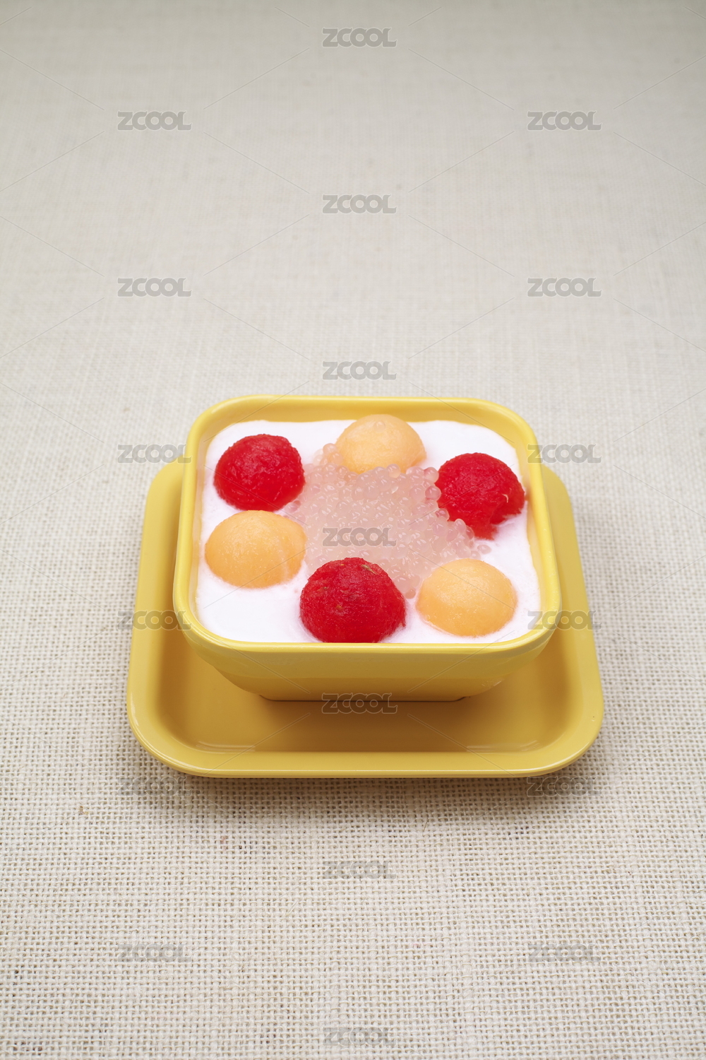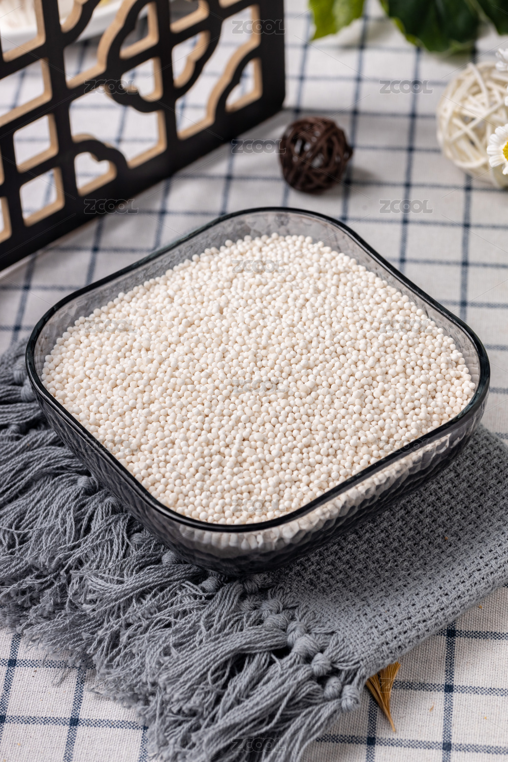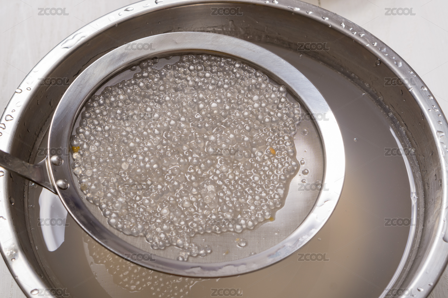 人手拿著奶壺往一碗香芋西米露中倒牛奶