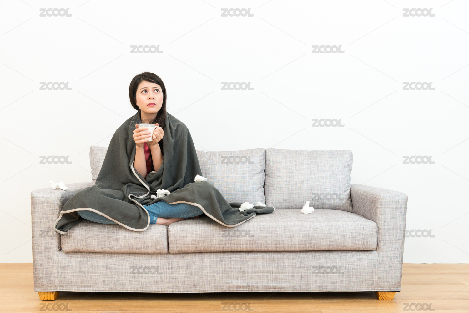 美麗漂亮的女teenger感冒坐在沙發(fā)上沙發(fā)上,拿著熱咖啡的杯子看著用木地板白色背景思考解決方案。