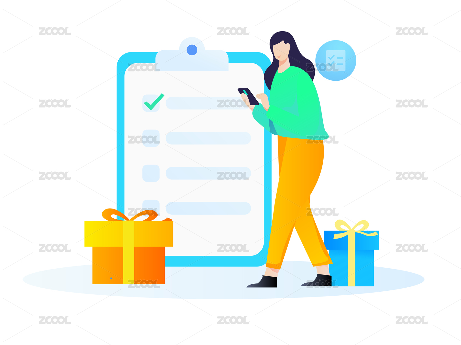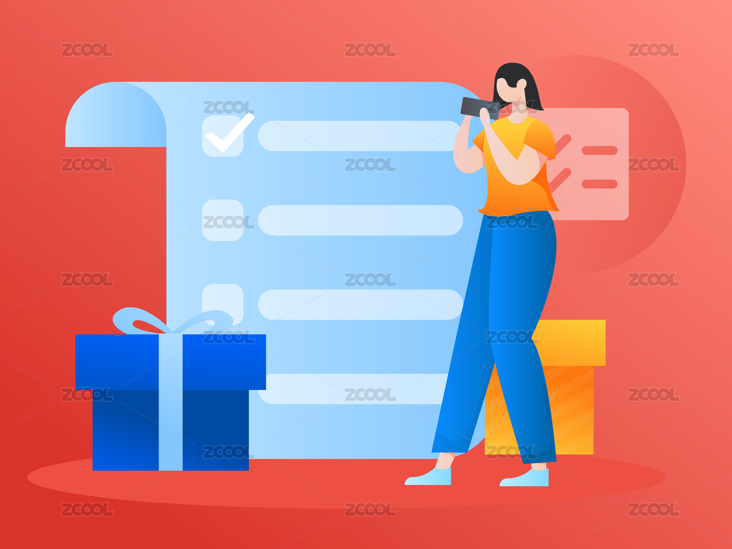女孩通過(guò)手機(jī)進(jìn)行有獎(jiǎng)問(wèn)卷調(diào)查,矢量扁平概念插畫(huà)