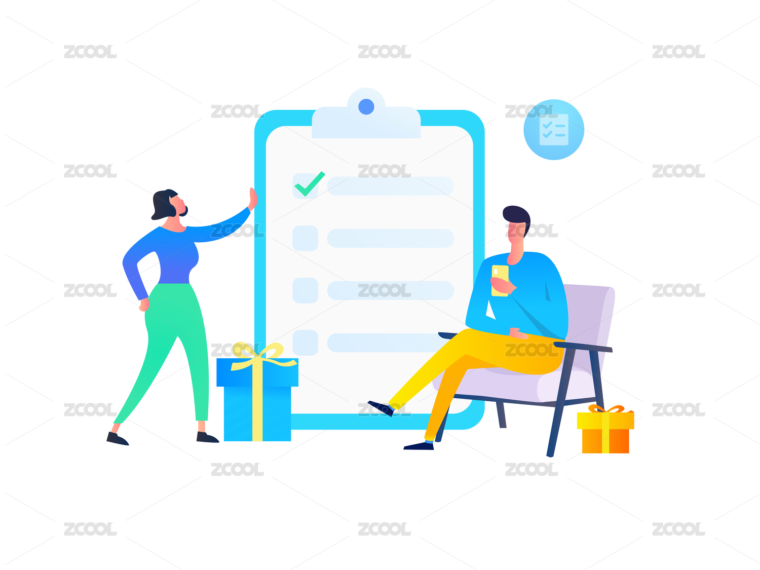男女通過(guò)手機(jī)進(jìn)行有獎(jiǎng)問(wèn)卷調(diào)查問(wèn)卷報(bào)告的男子,矢量扁平概念插畫(huà)