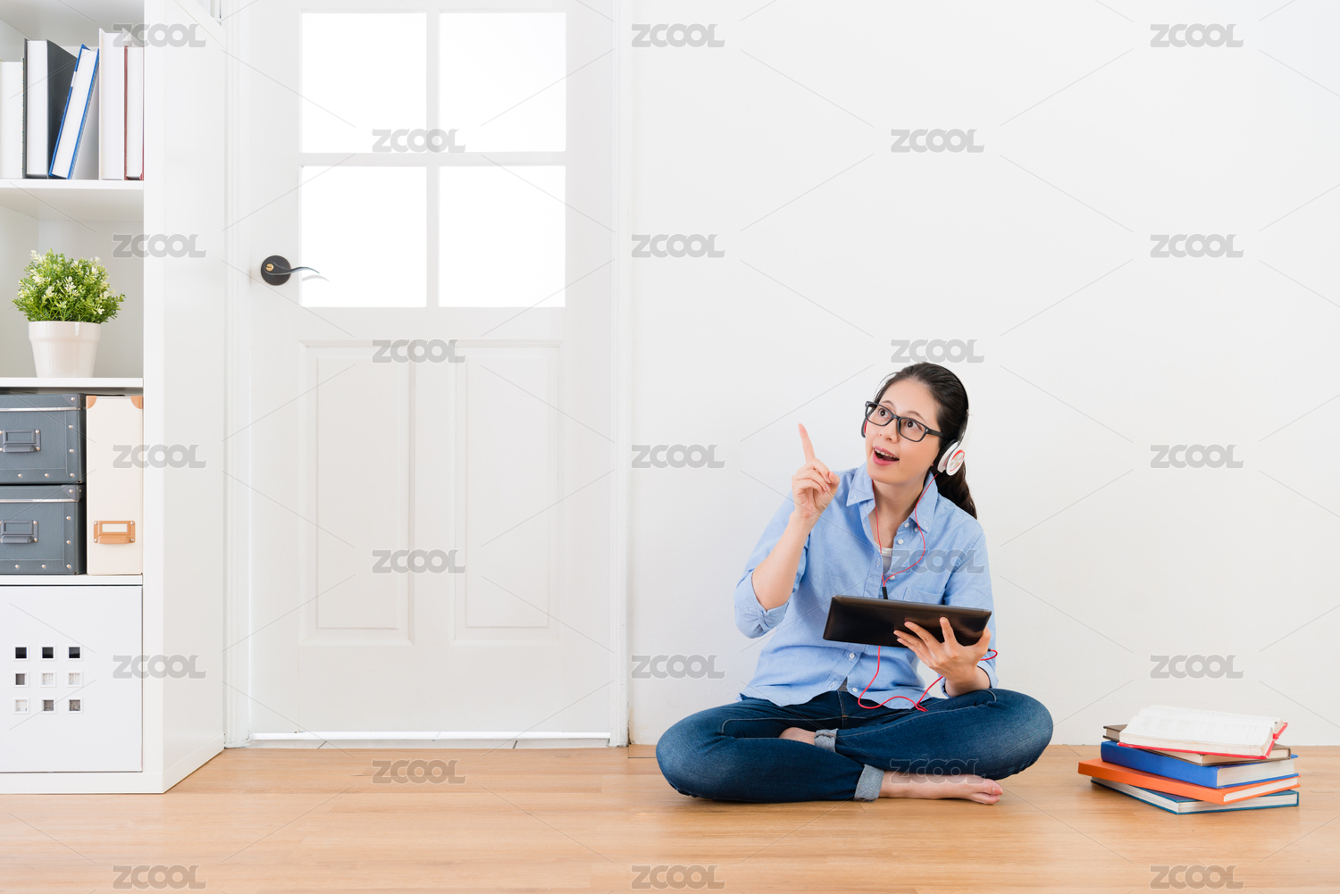 有學(xué)校功課好主意開(kāi)朗的年輕女大學(xué)生時(shí),她使用移動(dòng)平板電腦聽(tīng)電子學(xué)習(xí)教育信息化研究坐在木地板。