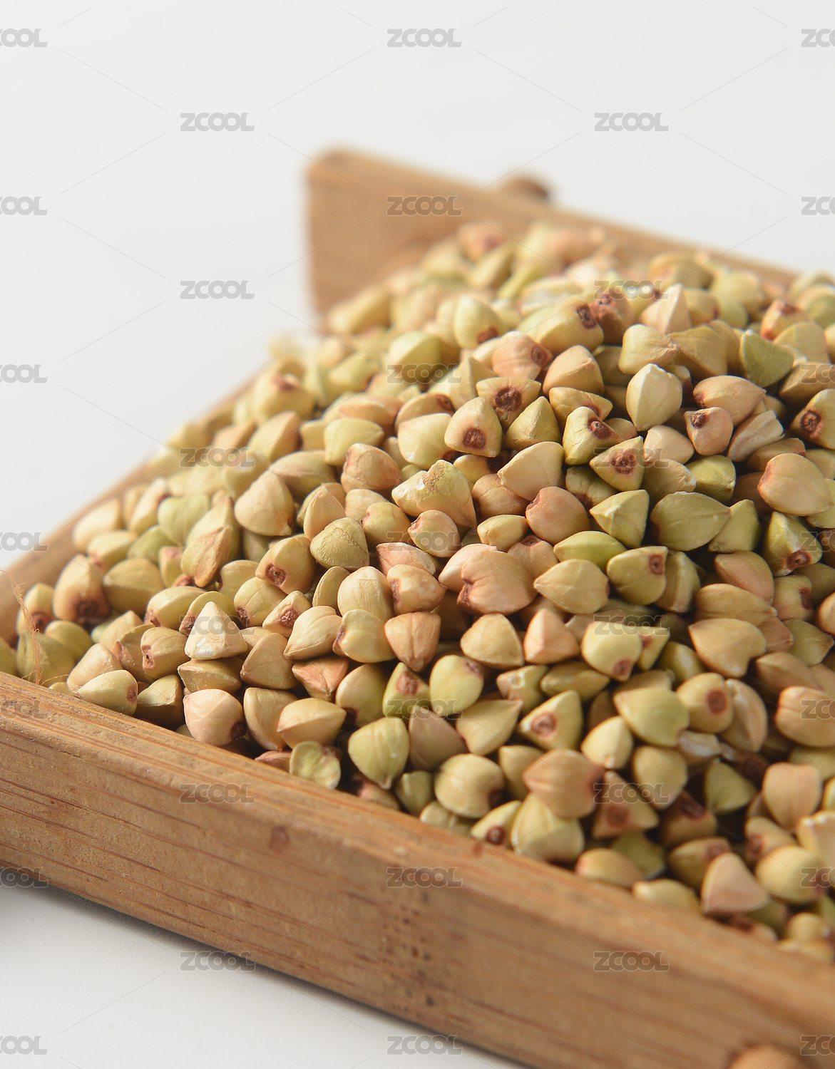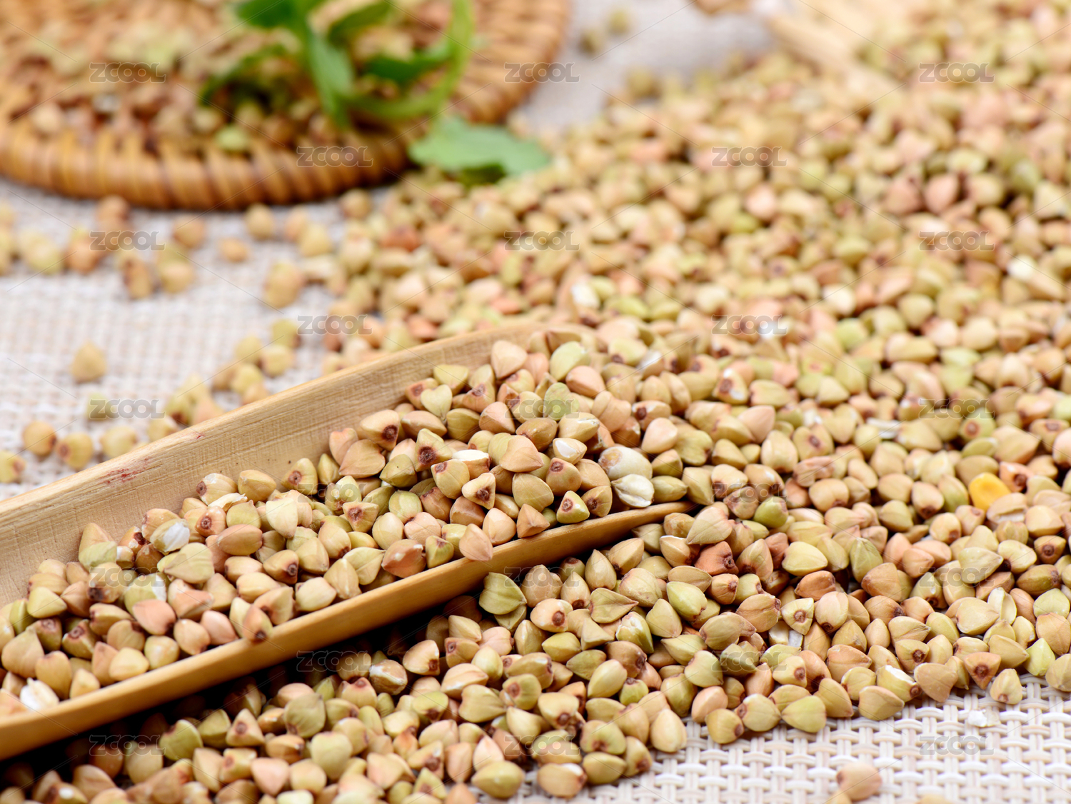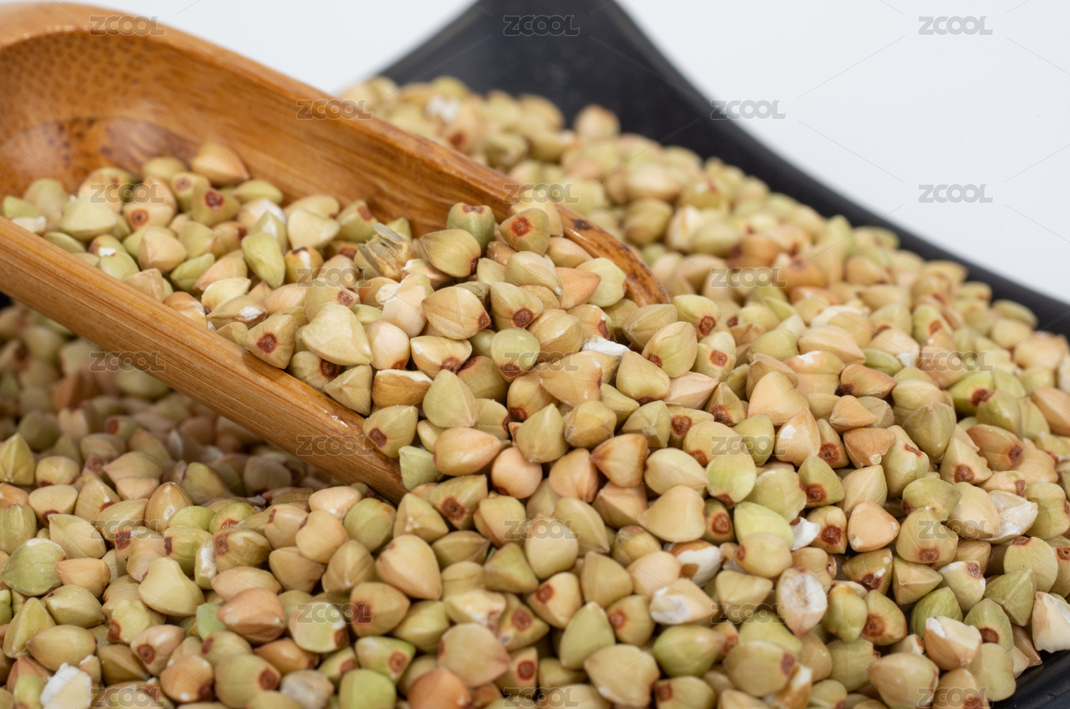 淺色背景下木勺里的蕎麥平鋪